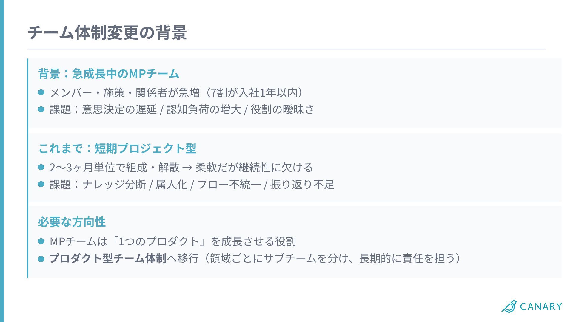 チーム体制変更の背景 背景:急成⻑中のMPチーム これまで:短期プロジェクト型 メンバー‧施策‧関係者が急増(7割が⼊社1年以内) 課題:意思決定の遅延 / 認知負荷の増⼤ / 役割の曖昧さ 2〜3ヶ⽉単位で組成‧解散