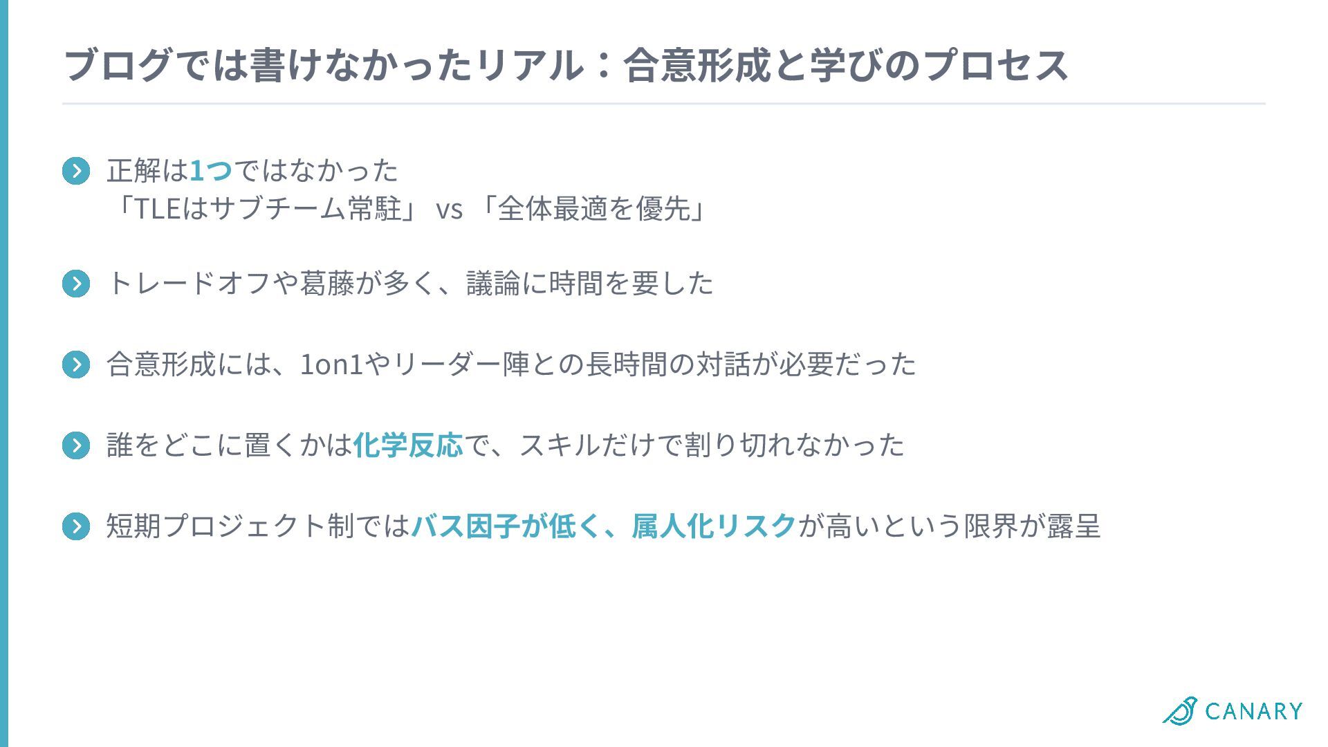 ブログでは書けなかったリアル:合意形成と学びのプロセス 正解は1つではなかった 「TLEはサブチーム常駐」 vs 「全体最適を優先」 トレードオフや葛藤が多く、議論に時間を要した 合意形成には、1on1やリーダー陣との⻑時間の対話が必要だった 誰をどこに置くかは化学反応で、スキルだけで割り切れなかった 短期プロジェクト制ではバス因⼦が低く、属⼈化リスクが⾼いという限界が露呈