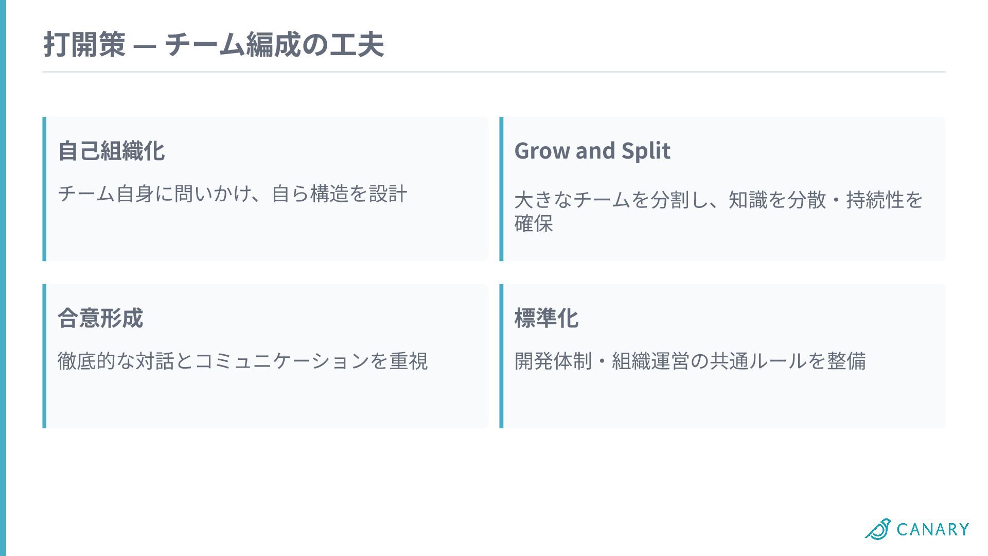 打開策 — チーム編成の⼯夫 ⾃⼰組織化 チーム⾃⾝に問いかけ、⾃ら構造を設計 Grow and Split ⼤きなチームを分割し、知識を分散‧持続性を 確保