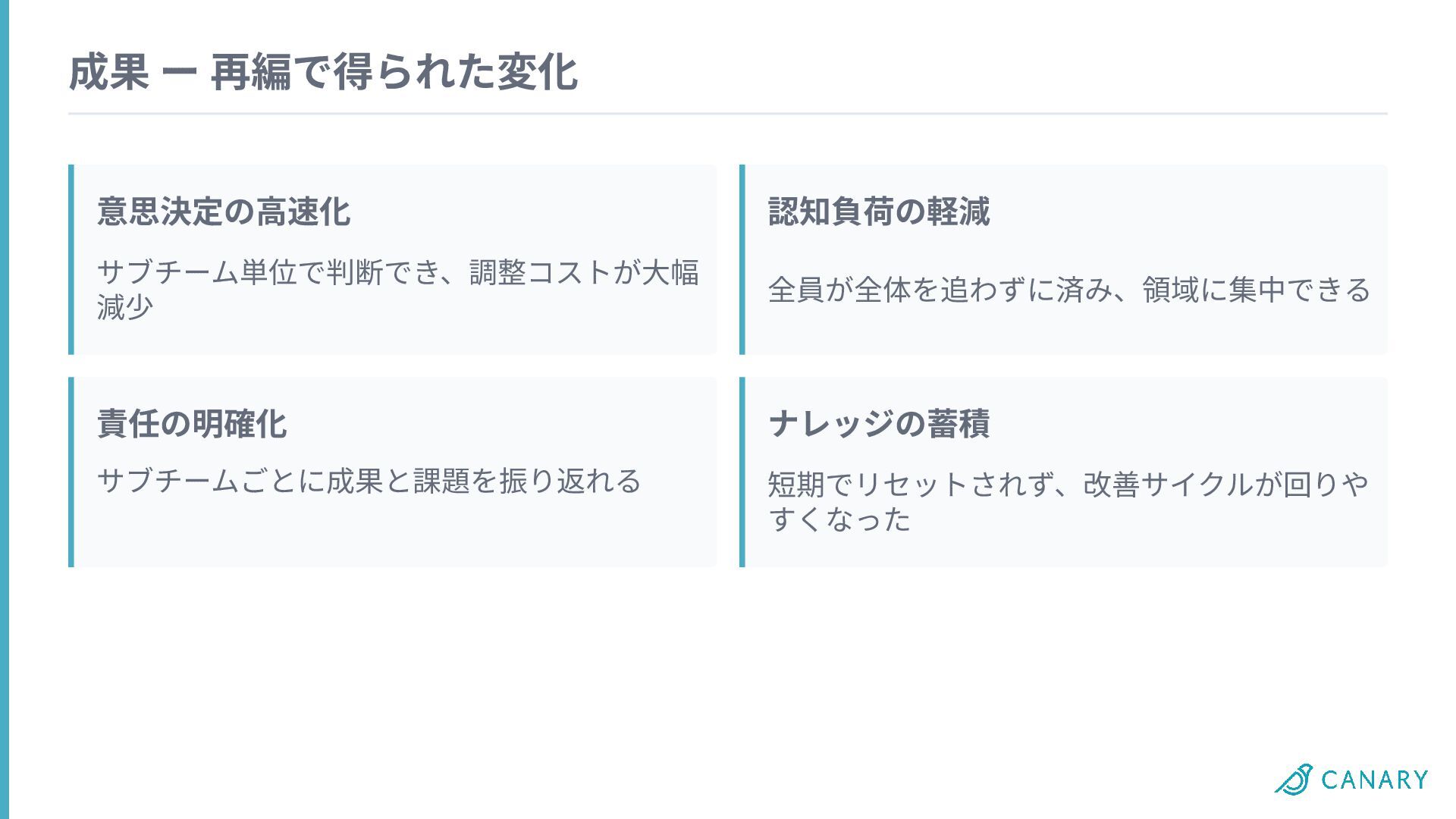 成果 ー 再編で得られた変化 意思決定の⾼速化 認知負荷の軽減 責任の明確化 ナレッジの蓄積 サブチーム単位で判断でき、調整コストが⼤幅 減少 全員が全体を追わずに済み、領域に集中できる