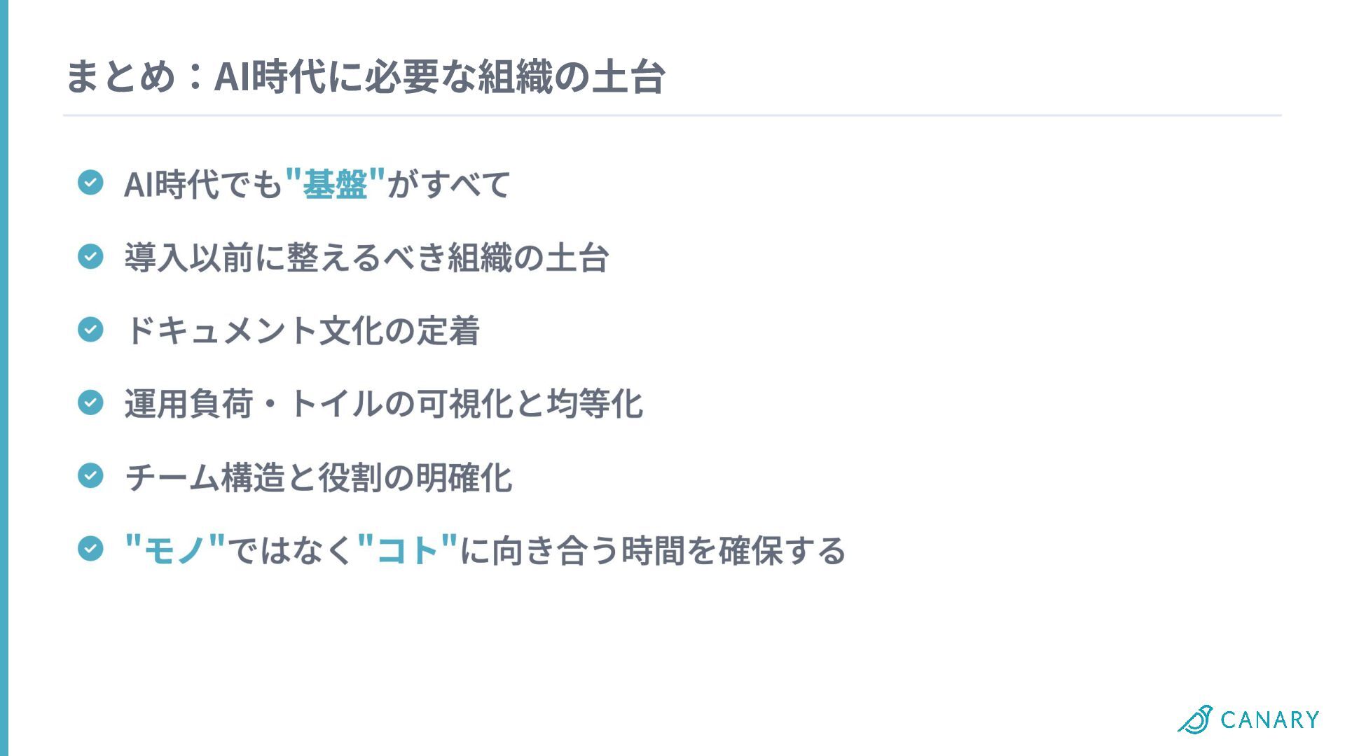 まとめ:AI時代に必要な組織の⼟台 AI時代でも"基盤"がすべて 導⼊以前に整えるべき組織の⼟台 ドキュメント⽂化の定着 運⽤負荷‧トイルの可視化と均等化 チーム構造と役割の明確化 "モノ"ではなく"コト"に向き合う時間を確保する