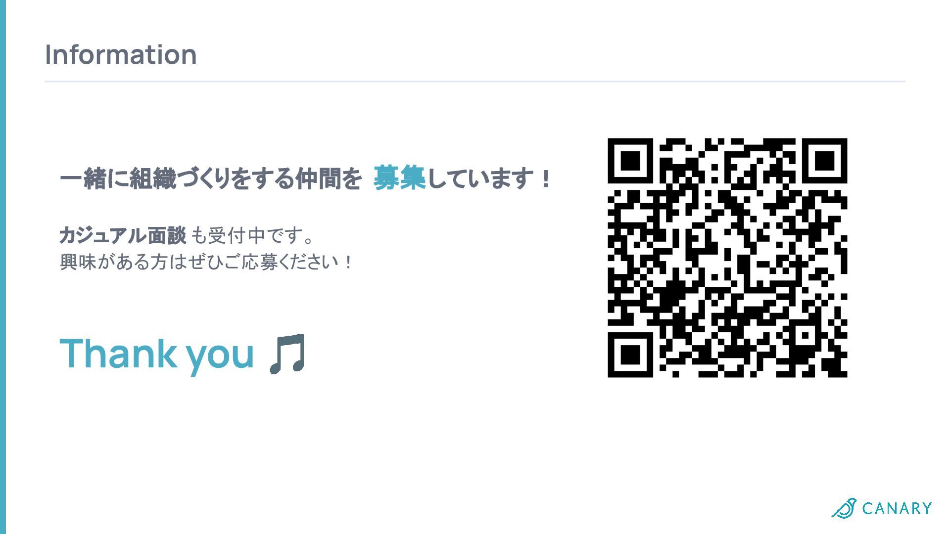 Information 一緒に組織づくりをする仲間を 募集しています! カジュアル面談 も受付中です。 興味がある方はぜひご応募ください! Thank you 🎵