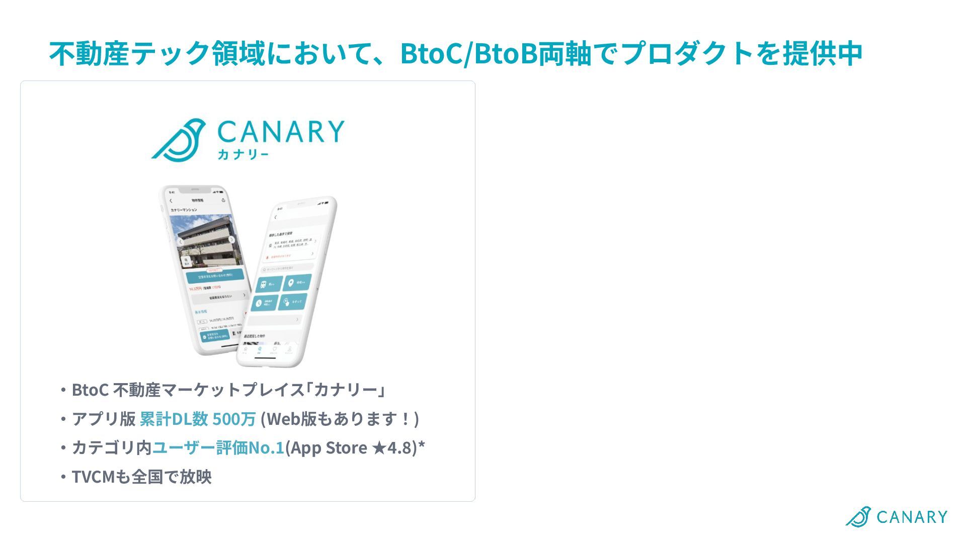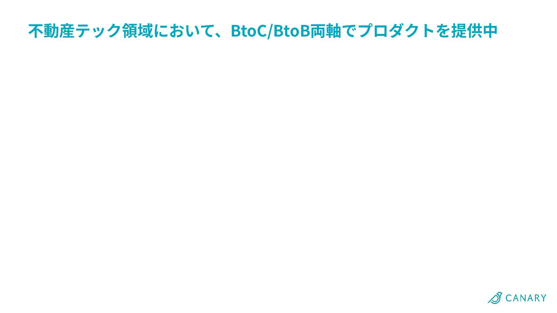 不動産テック領域において、BtoC/BtoB両軸でプロダクトを提供中 ‧BtoC 不動産マーケットプレイス「カナリー」 ‧アプリ版 累計DL数 500万 (Web版もあります!) ‧カテゴリ内ユーザー評価No.1(App Store ★4.8)*