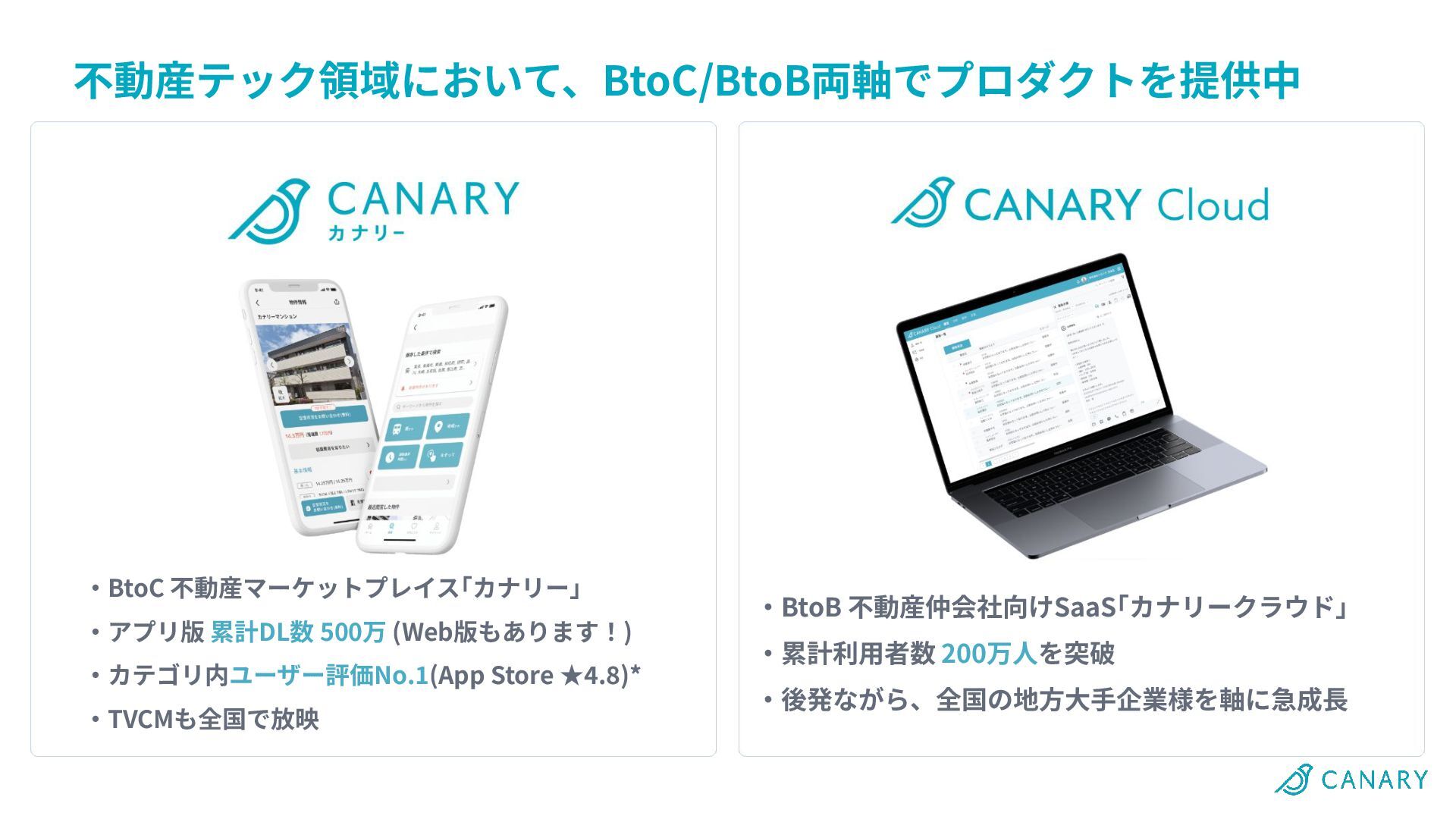 ‧TVCMも全国で放映 ‧BtoB 不動産仲会社向けSaaS「カナリークラウド」 ‧累計利⽤者数 200万⼈を突破 ‧後発ながら、全国の地⽅⼤⼿企業様を軸に急成⻑