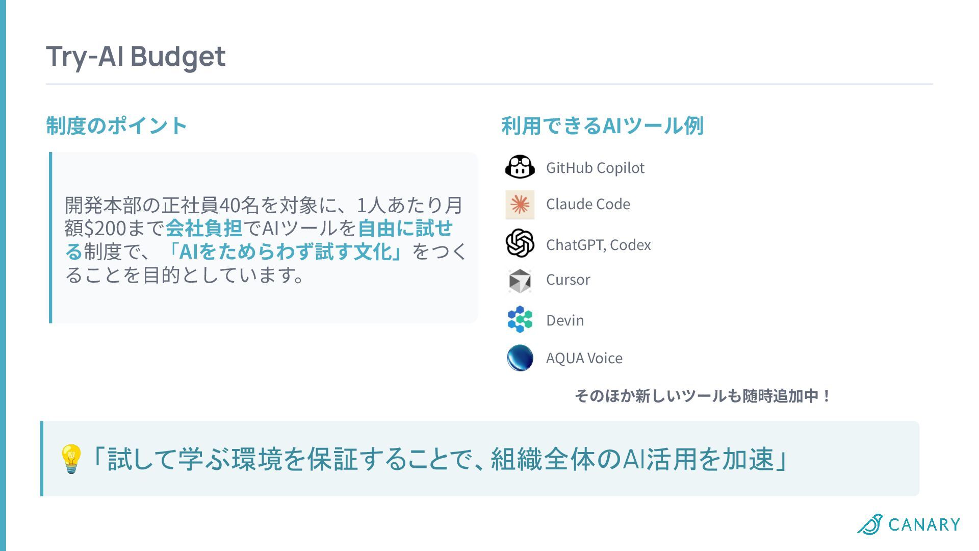 AQUA Voice Try-AI Budget 制度のポイント 利⽤できるAIツール例 開発本部の正社員40名を対象に、1⼈あたり⽉ 額$200まで会社負担でAIツールを⾃由に試せ る制度で、「AIをためらわず試す⽂化」をつく ることを⽬的としています。