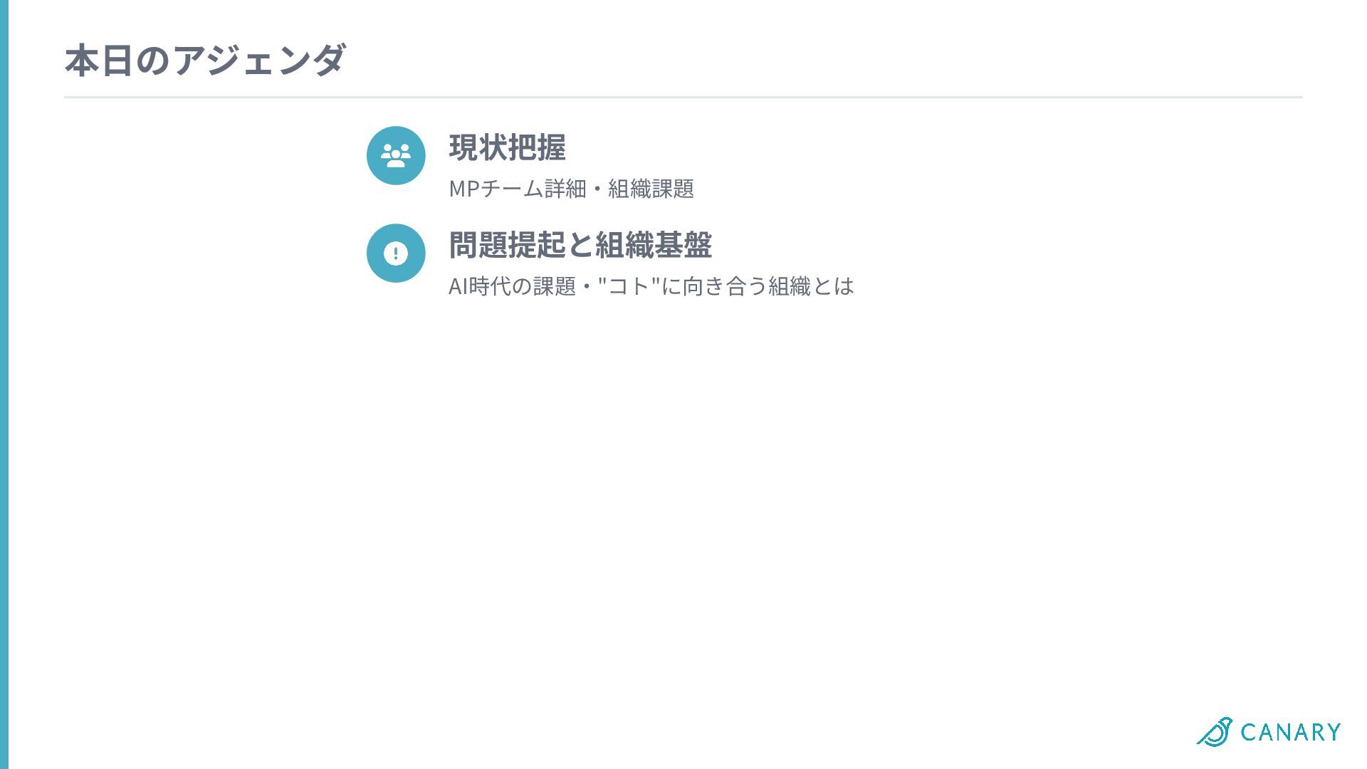 本⽇のアジェンダ 現状把握 MPチーム詳細‧組織課題