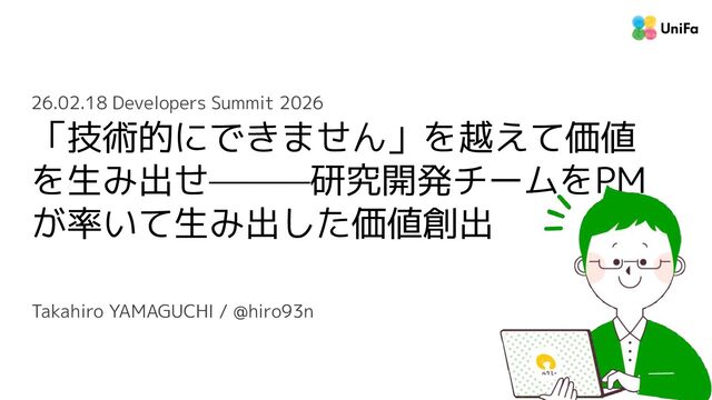 18-C-4 02/18 15:10 ~ 15:40 「技術的にできません」を越えて価値を生み出せ──研究開発チームをPMが率いて生み出した価値創出 https://event.shoeisha.jp/devsumi/20260218/session/6438