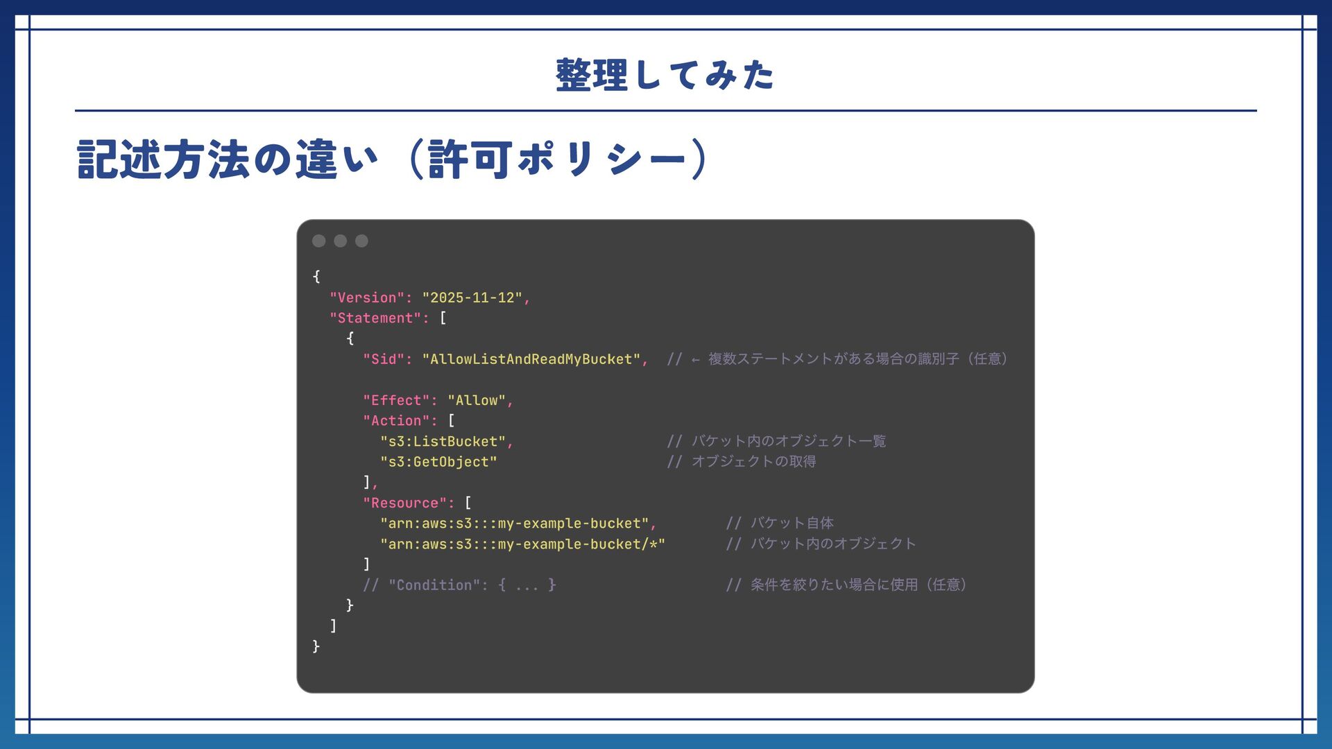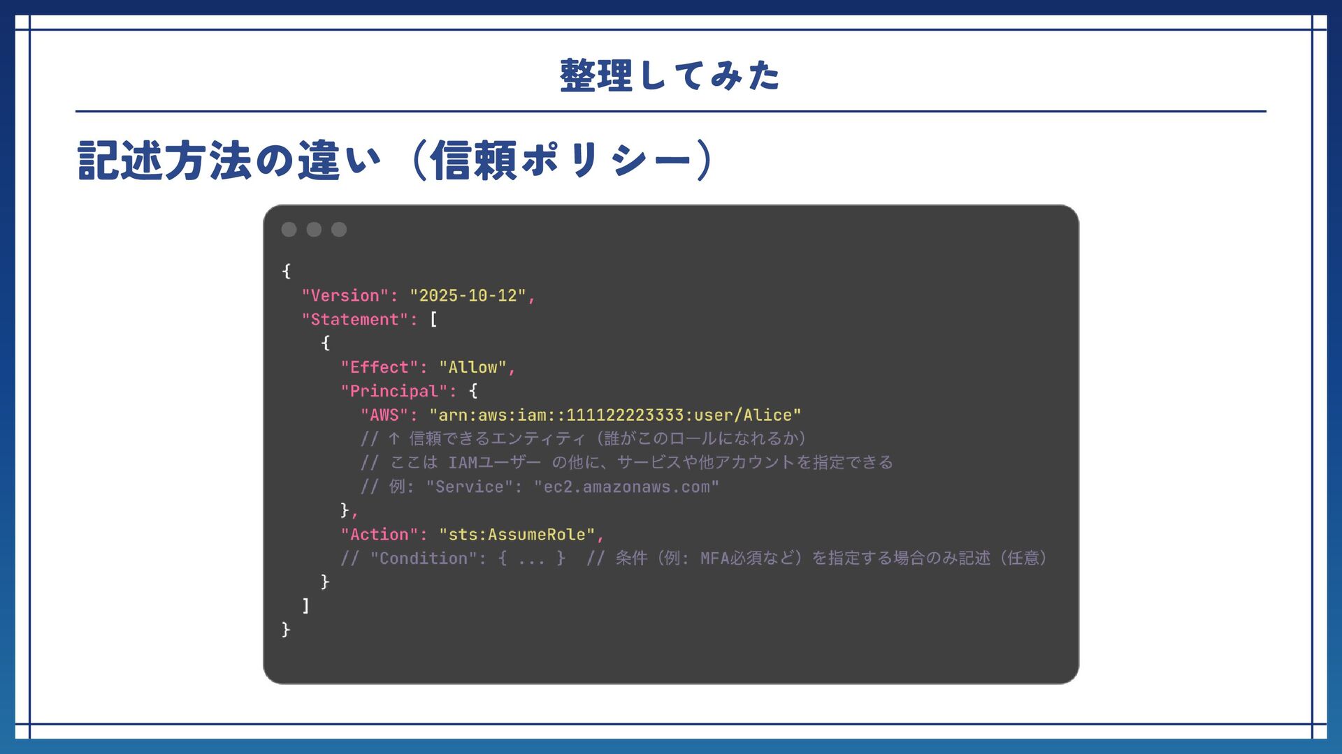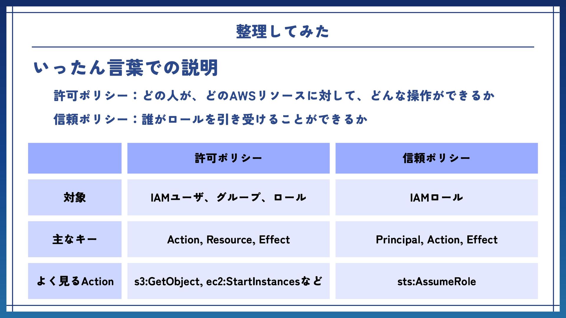 Effect Principal, Action, Effect よく見るAction s3:GetObject, ec2:StartInstancesなど sts:AssumeRole 整理してみた いったん言葉での説明 許可ポリシー:どの人が、どのAWSリソースに対して、どんな操作ができるか 信頼ポリシー:誰がロールを引き受けることができるか