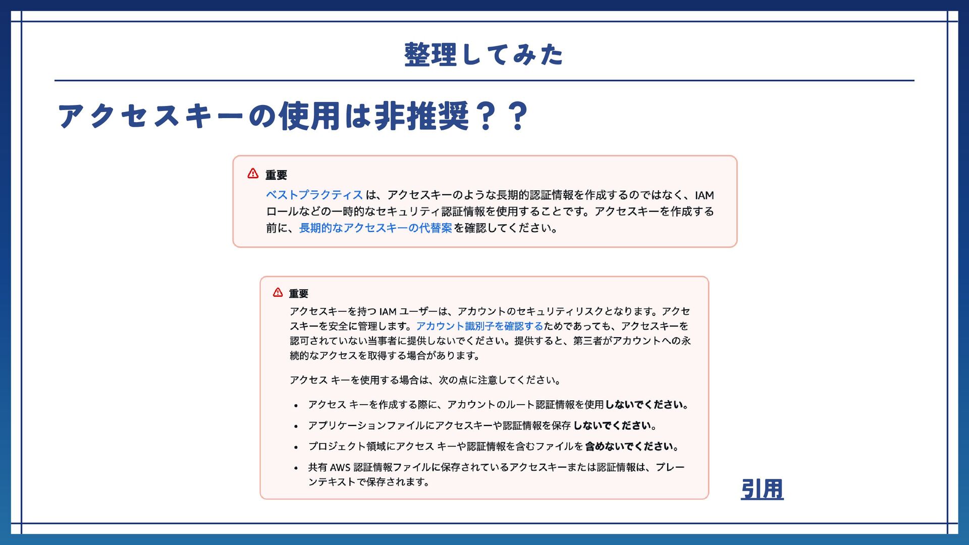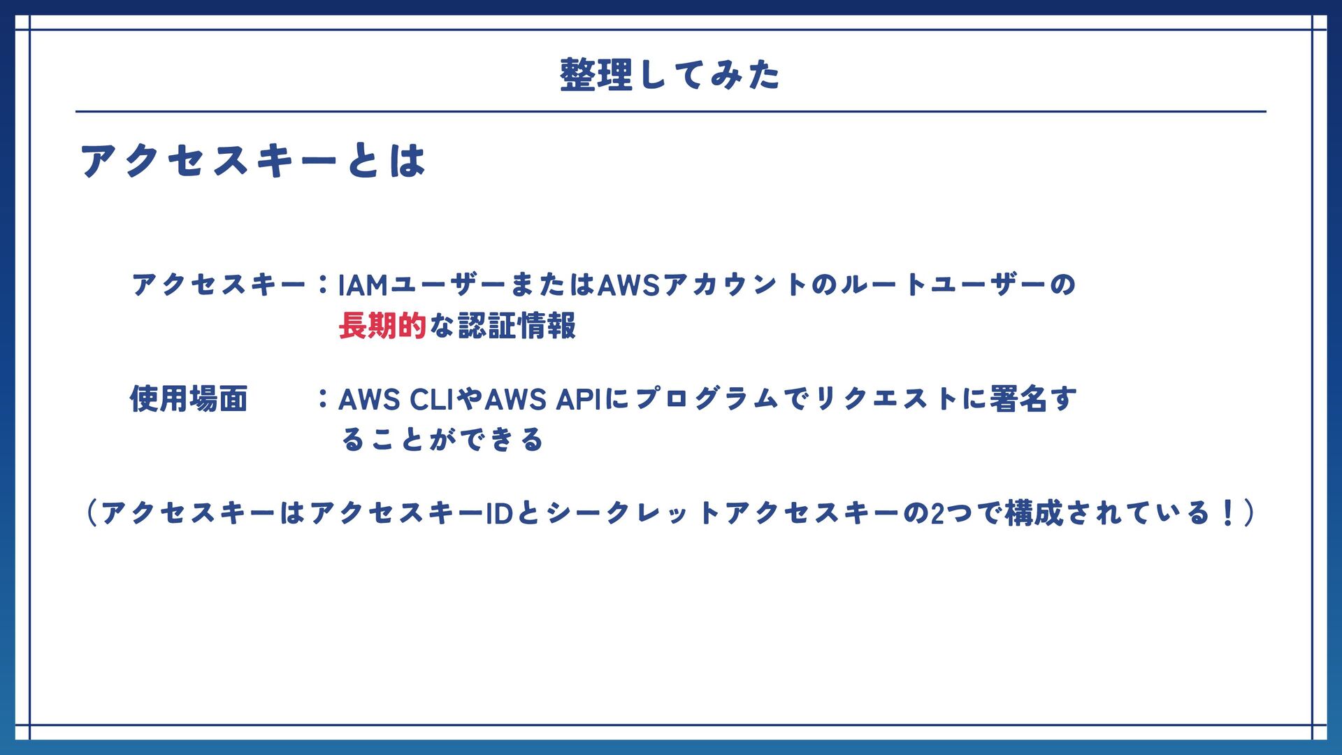 機能の設計と 画面の構成 整理してみた アクセスキーとは アクセスキー:IAMユーザーまたはAWSアカウントのルートユーザーの 長期的な認証情報 使用場面 :AWS CLIやAWS APIにプログラムでリクエストに署名す ることができる