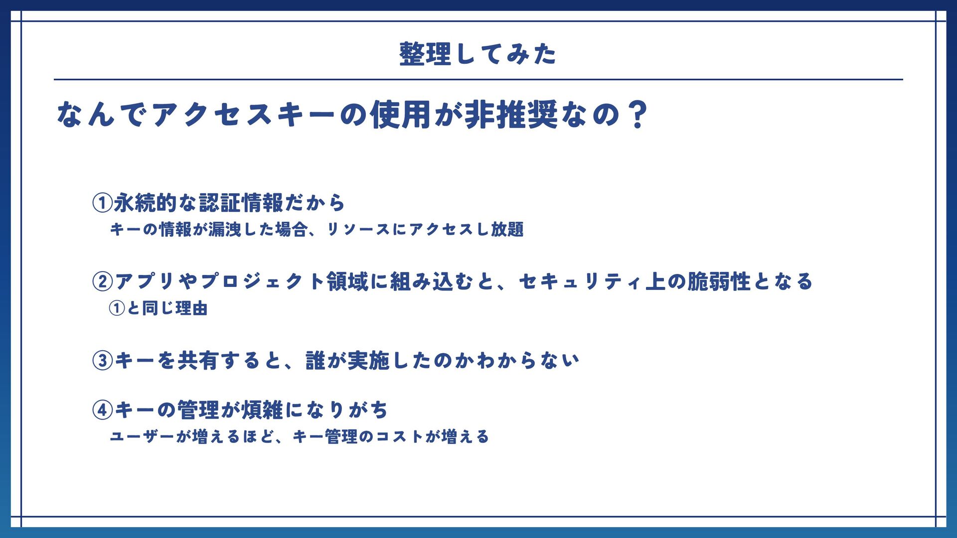 機能の設計と 画面の構成 整理してみた なんでアクセスキーの使用が非推奨なの? ①永続的な認証情報だから キーの情報が漏洩した場合、リソースにアクセスし放題 ②アプリやプロジェクト領域に組み込むと、セキュリティ上の脆弱性となる ①と同じ理由 ③キーを共有すると、誰が実施したのかわからない ④キーの管理が煩雑になりがち