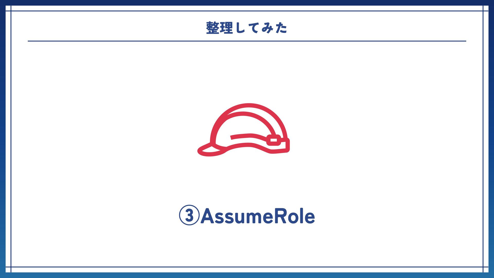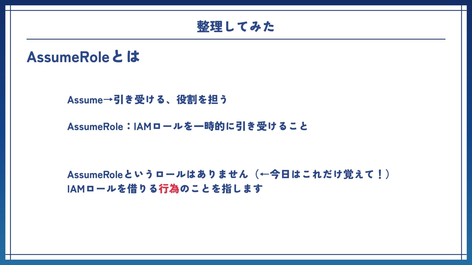 機能の設計と 画面の構成 整理してみた AssumeRoleとは AssumeRole:IAMロールを一時的に引き受けること Assume→引き受ける、役割を担う AssumeRoleというロールはありません(←今日はこれだけ覚えて!) IAMロールを借りる行為のことを指します
