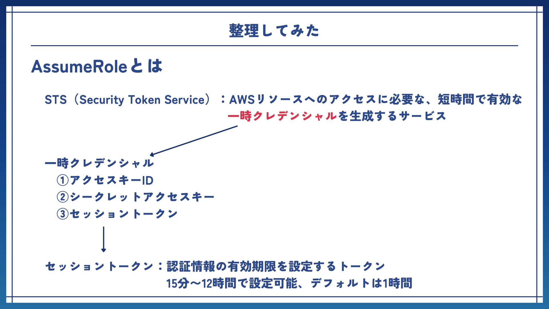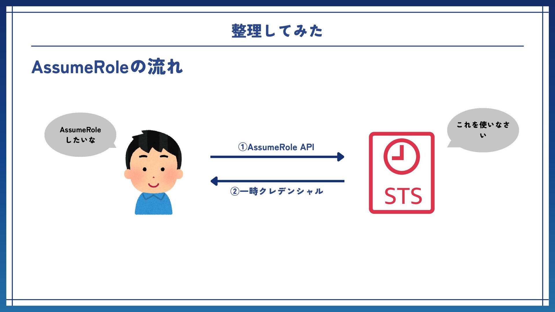 機能の設計と 画面の構成 AssumeRole したいな 整理してみた AssumeRoleの流れ ①AssumeRole API ②一時クレデンシャル これを使いなさ