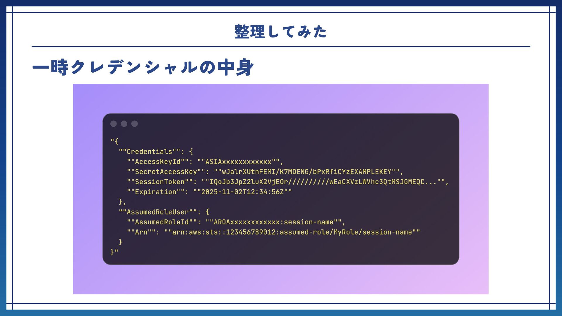 AWSリソースへのアクセスに必要な、短時間で有効な「一時的な認証情報」を生成するサービスAssumeRole:IAMロールを一時的に引き受けること AssumeRole:IAMロールを一時的に引き受けること 機能の設計と 画面の構成 整理してみた 一時クレデンシャルの中身