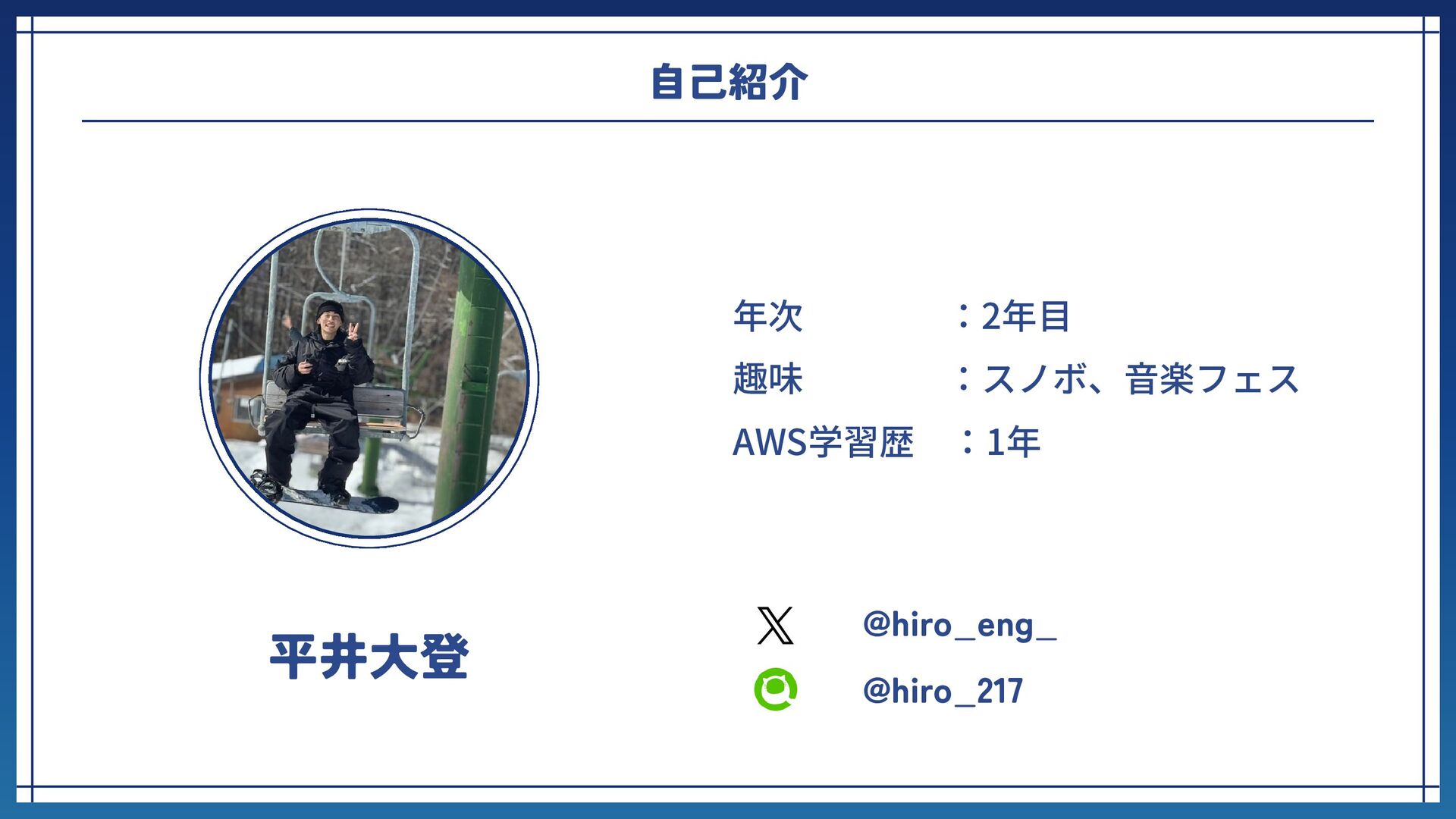 自己紹介 平井大登 年次 :2年目 趣味 :スノボ、音楽フェス AWS学習歴 :1年 @hiro_eng_ @hiro_217