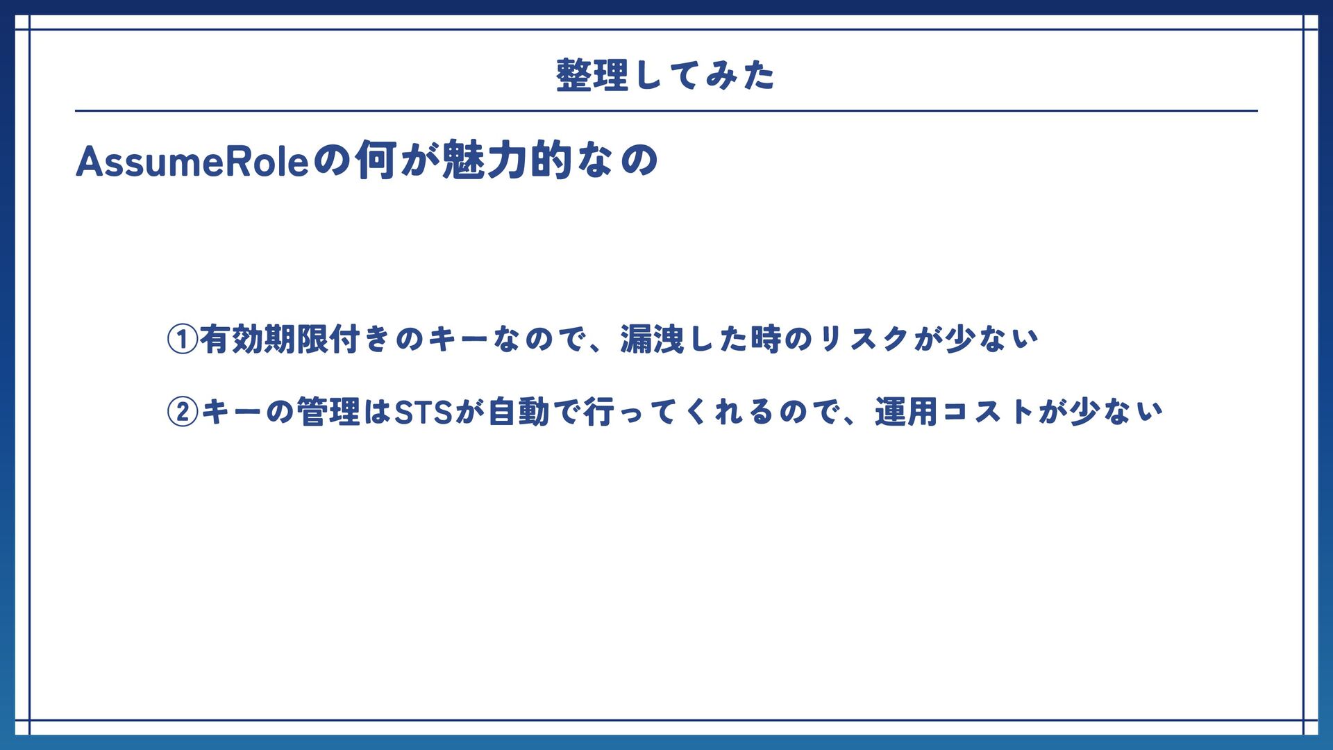 AWSリソースへのアクセスに必要な、短時間で有効な「一時的な認証情報」を生成するサービスAssumeRole:IAMロールを一時的に引き受けること AssumeRole:IAMロールを一時的に引き受けること 機能の設計と 画面の構成 整理してみた AssumeRoleの何が魅力的なの ①有効期限付きのキーなので、漏洩した時のリスクが少ない ②キーの管理はSTSが自動で行ってくれるので、運用コストが少ない
