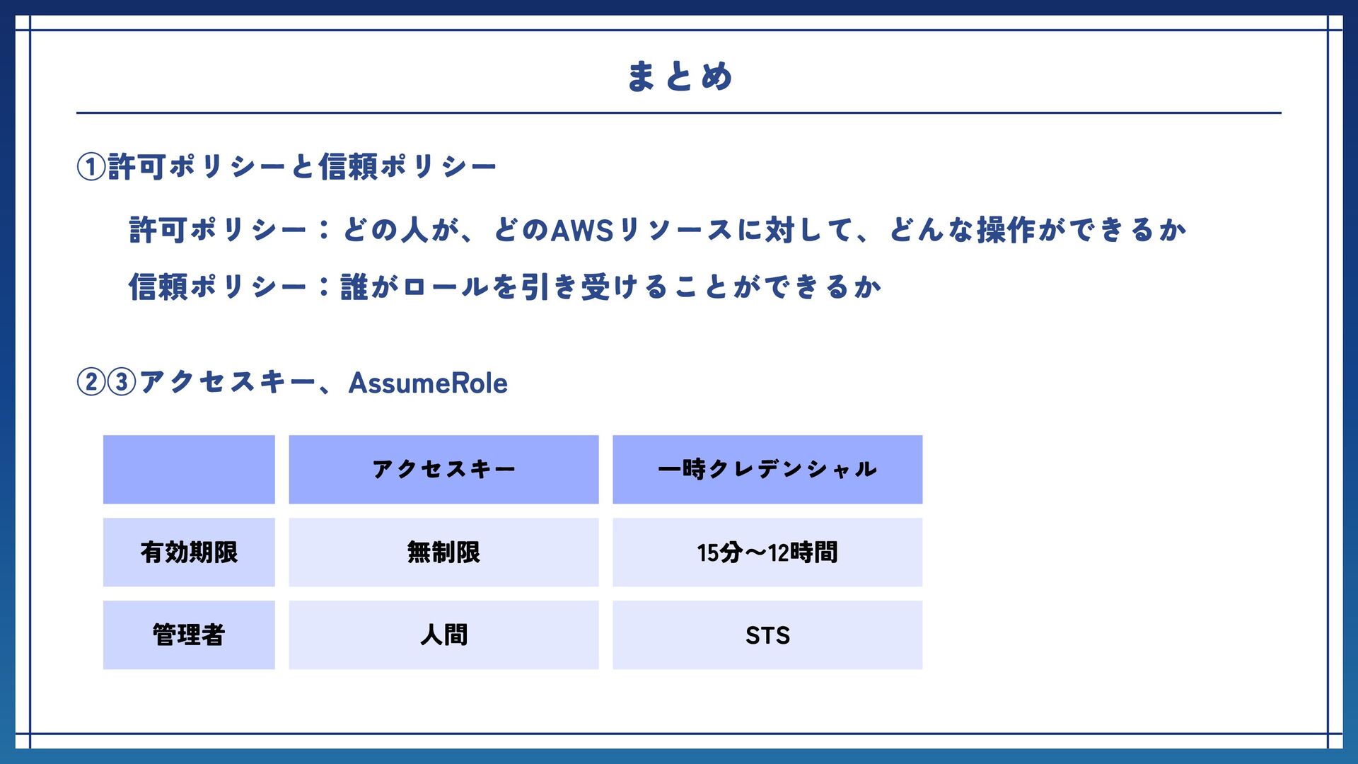 まとめ ①許可ポリシーと信頼ポリシー ②③アクセスキー、AssumeRole 許可ポリシー:どの人が、どのAWSリソースに対して、どんな操作ができるか 信頼ポリシー:誰がロールを引き受けることができるか