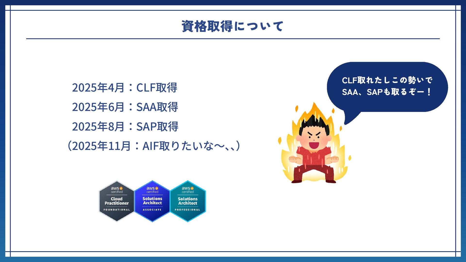 2025年4月:CLF取得 2025年6月:SAA取得 2025年8月:SAP取得 (2025年11月:AIF取りたいな〜、 、 ) CLF取れたしこの勢いで SAA、SAPも取るぞー! 資格取得について