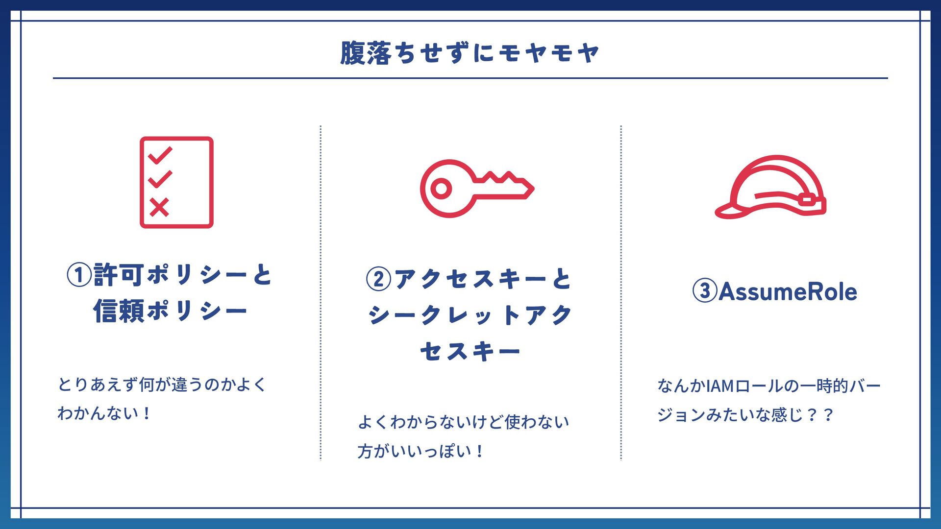腹落ちせずにモヤモヤ ①許可ポリシーと 信頼ポリシー とりあえず何が違うのかよく わかんない! ③AssumeRole なんかIAMロールの一時的バー ジョンみたいな感じ?? よくわからないけど使わない 方がいいっぽい!