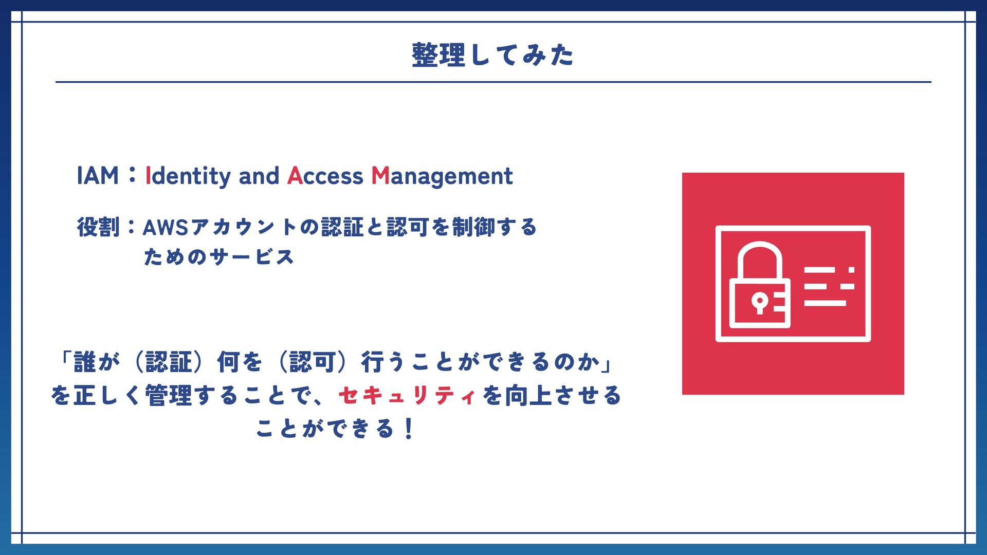 機能の設計と 画面の構成 整理してみた IAM:Identity and Access Management 役割:AWSアカウントの認証と認可を制御する ためのサービス 「誰が(認証)何を(認可)行うことができるのか」