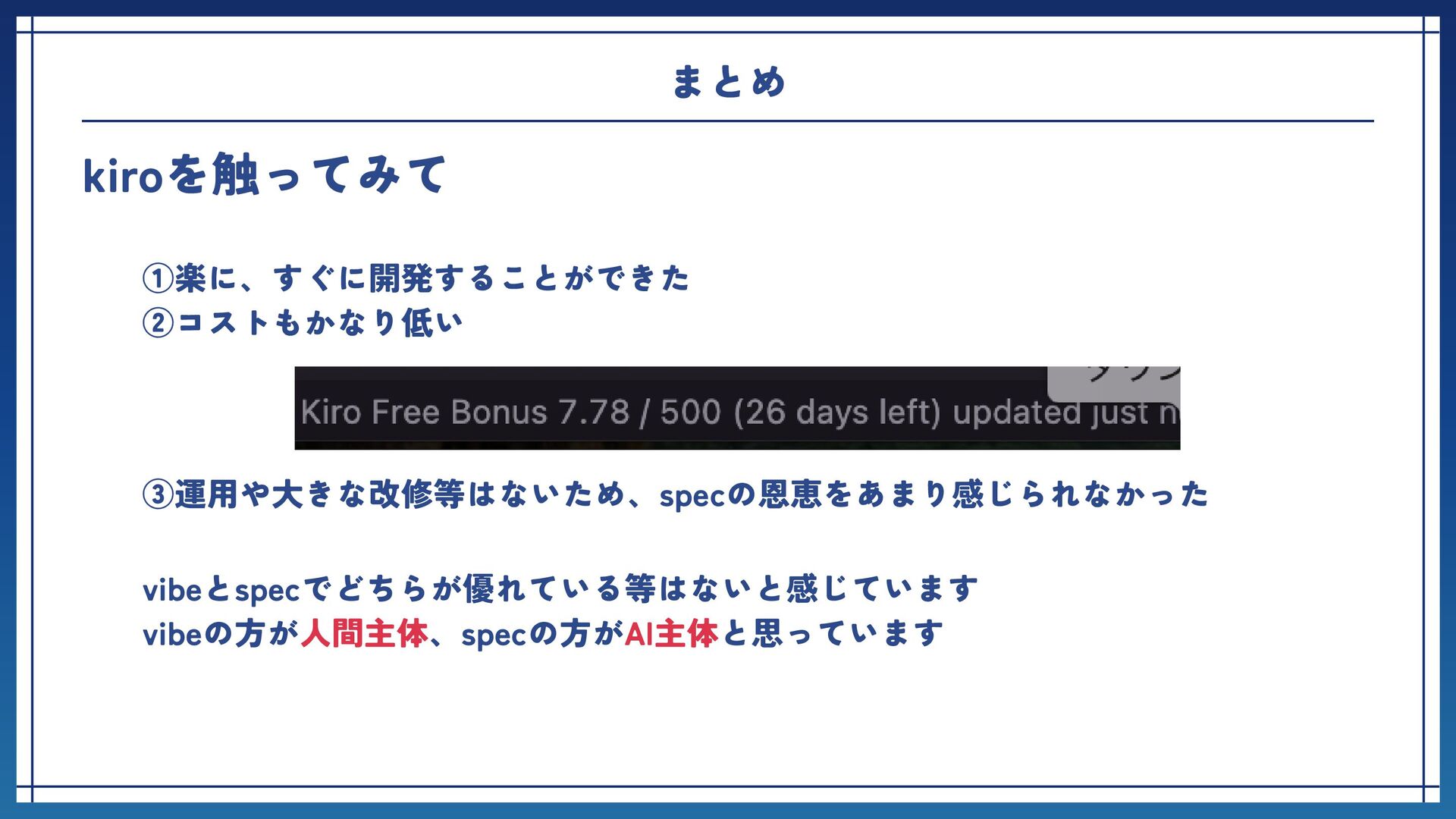 機能の設計と 画面の構成 まとめ kiroを触ってみて ①楽に、すぐに開発することができた ②コストもかなり低い ③運用や大きな改修等はないため、specの恩恵をあまり感じられなかった vibeとspecでどちらが優れている等はないと感じています vibeの方が人間主体、specの方がAI主体と思っています