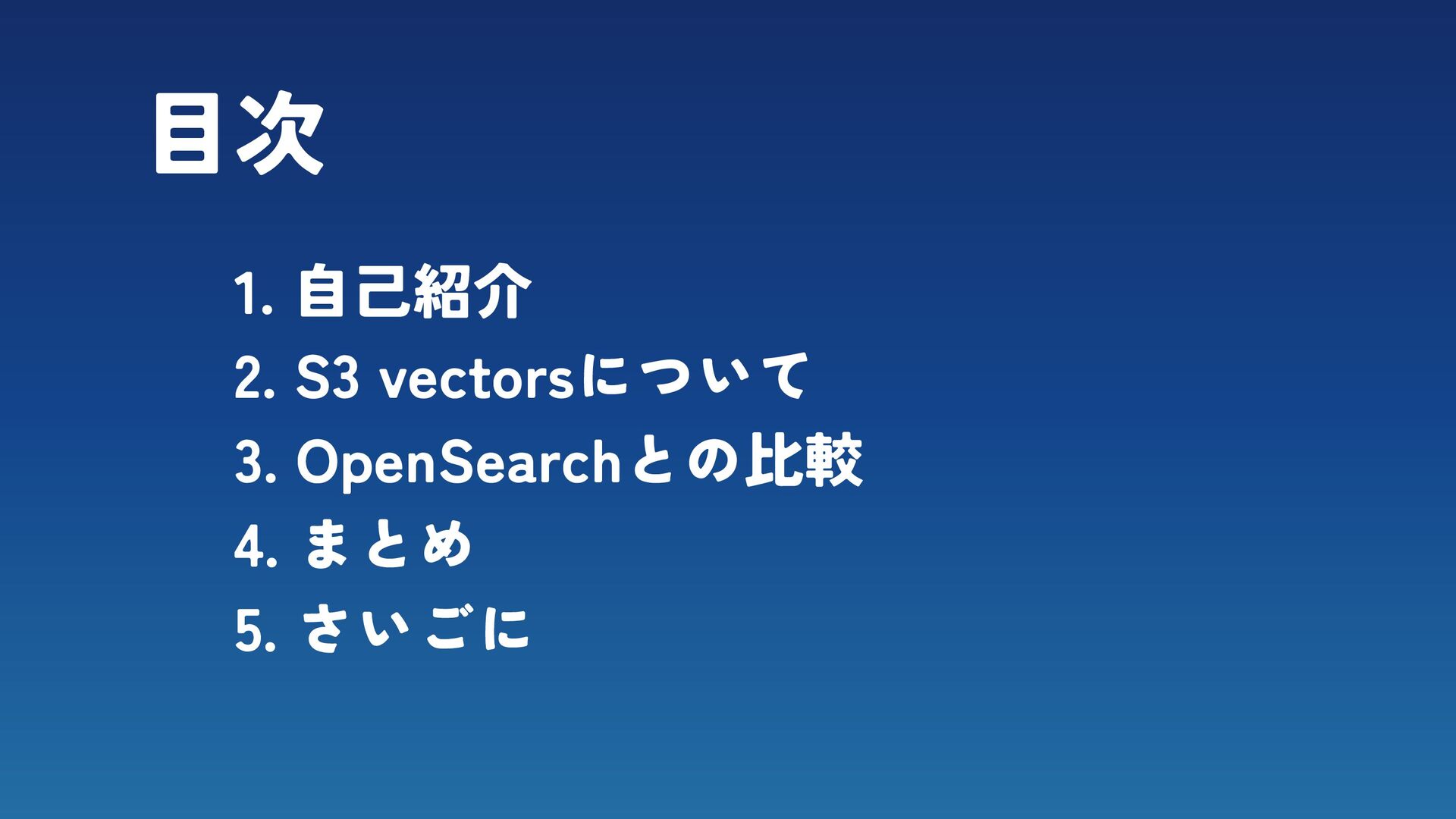 目次 1. 自己紹介 2. S3 vectorsについて 3. OpenSearchとの比較 4. まとめ