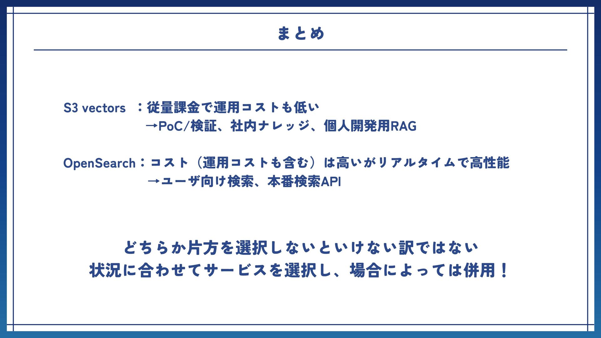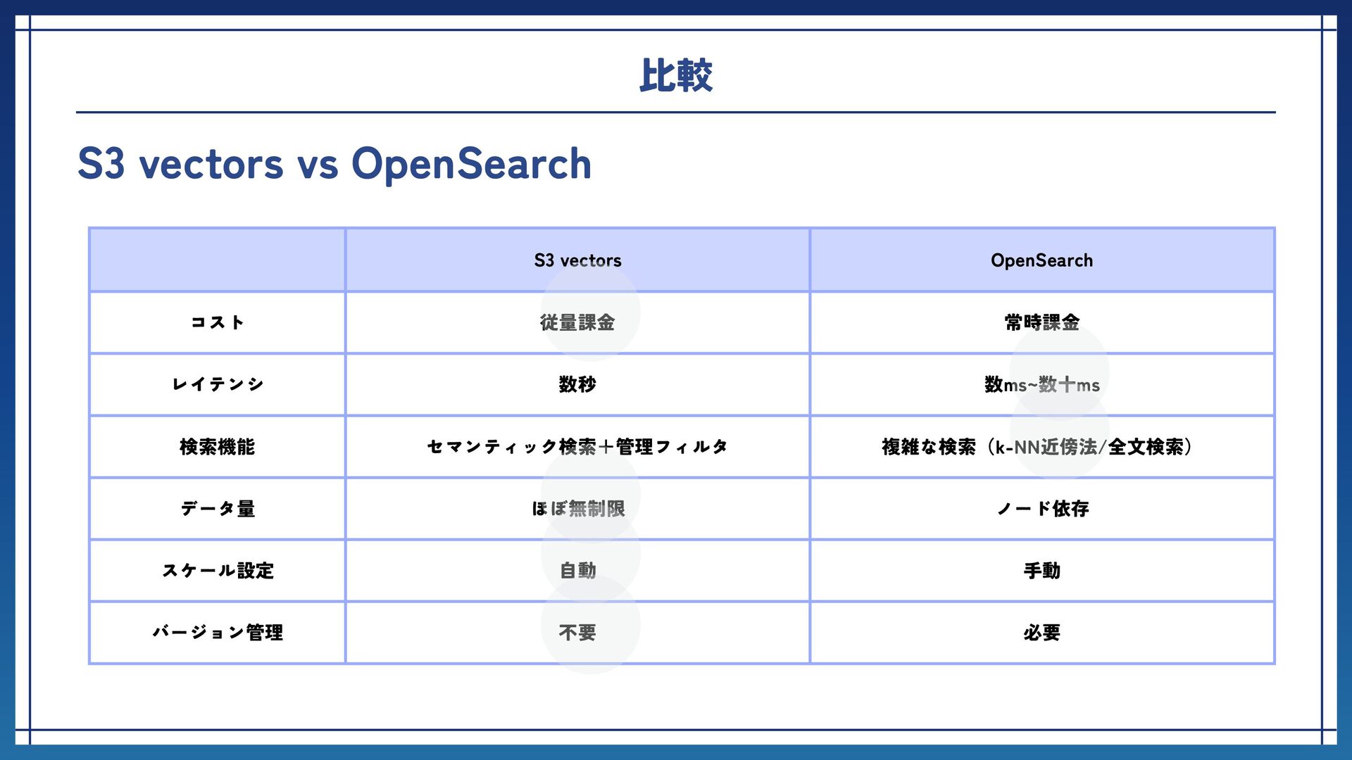 数ms~数十ms 検索機能 セマンティック検索+管理フィルタ 複雑な検索(k-NN近傍法/全文検索) データ量 ほぼ無制限 ノード依存 スケール設定 自動 手動 バージョン管理 不要 必要 比較 S3 vectors vs OpenSearch ⚪︎ ⚪︎ ⚪︎ ⚪︎ ⚪︎ ⚪︎