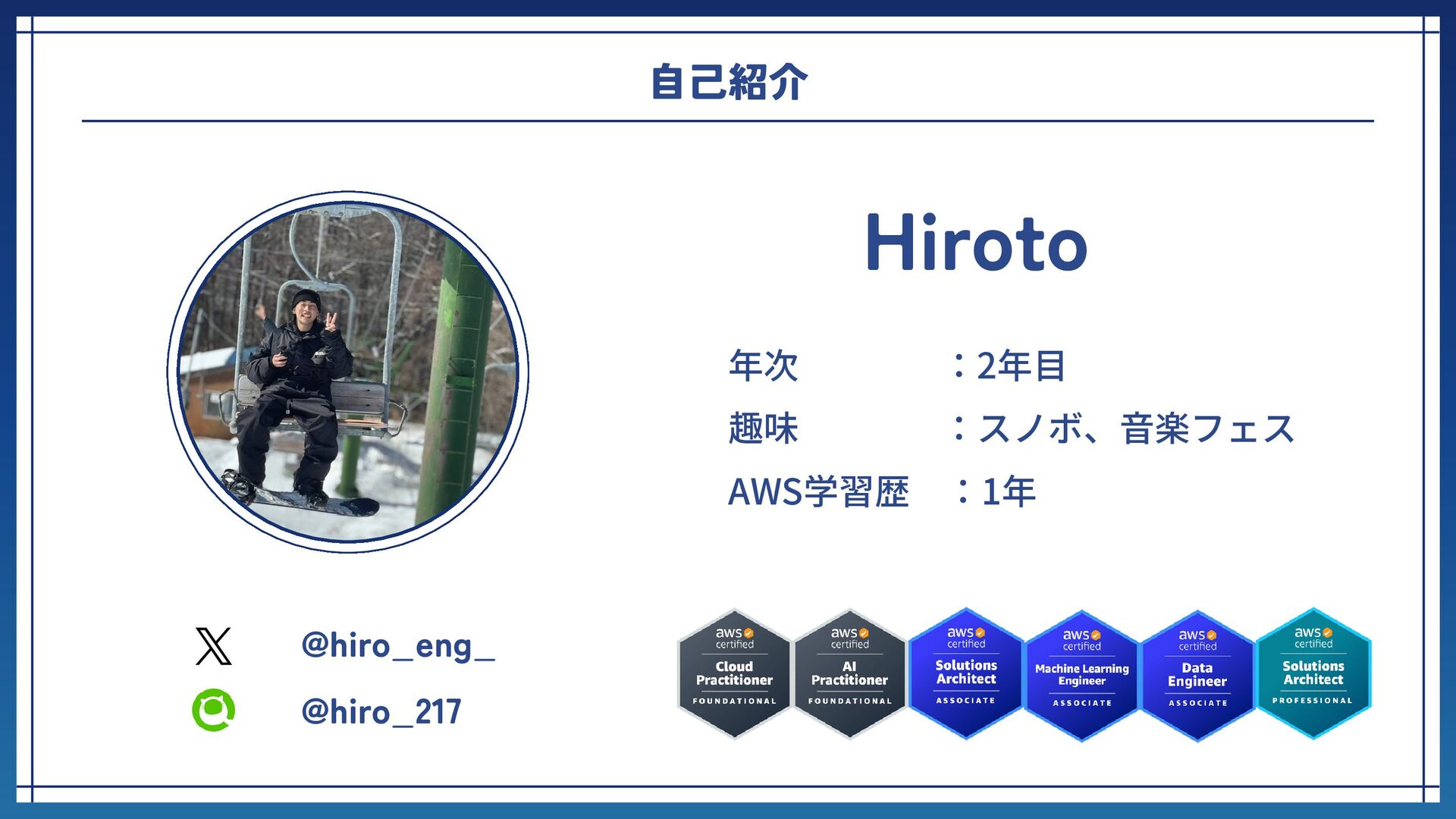 @hiro_eng_ @hiro_217 自己紹介 Hiroto 年次 :2年目 趣味 :スノボ、音楽フェス AWS学習歴 :1年