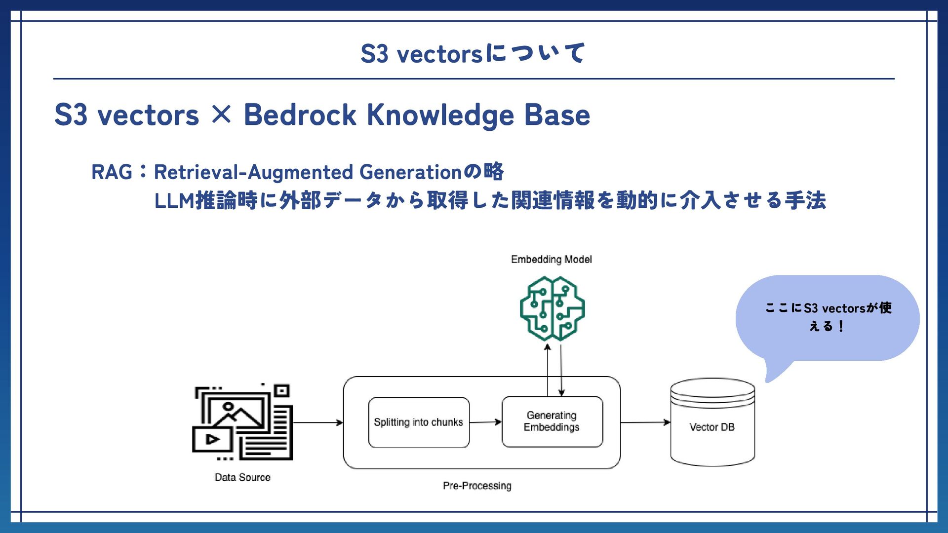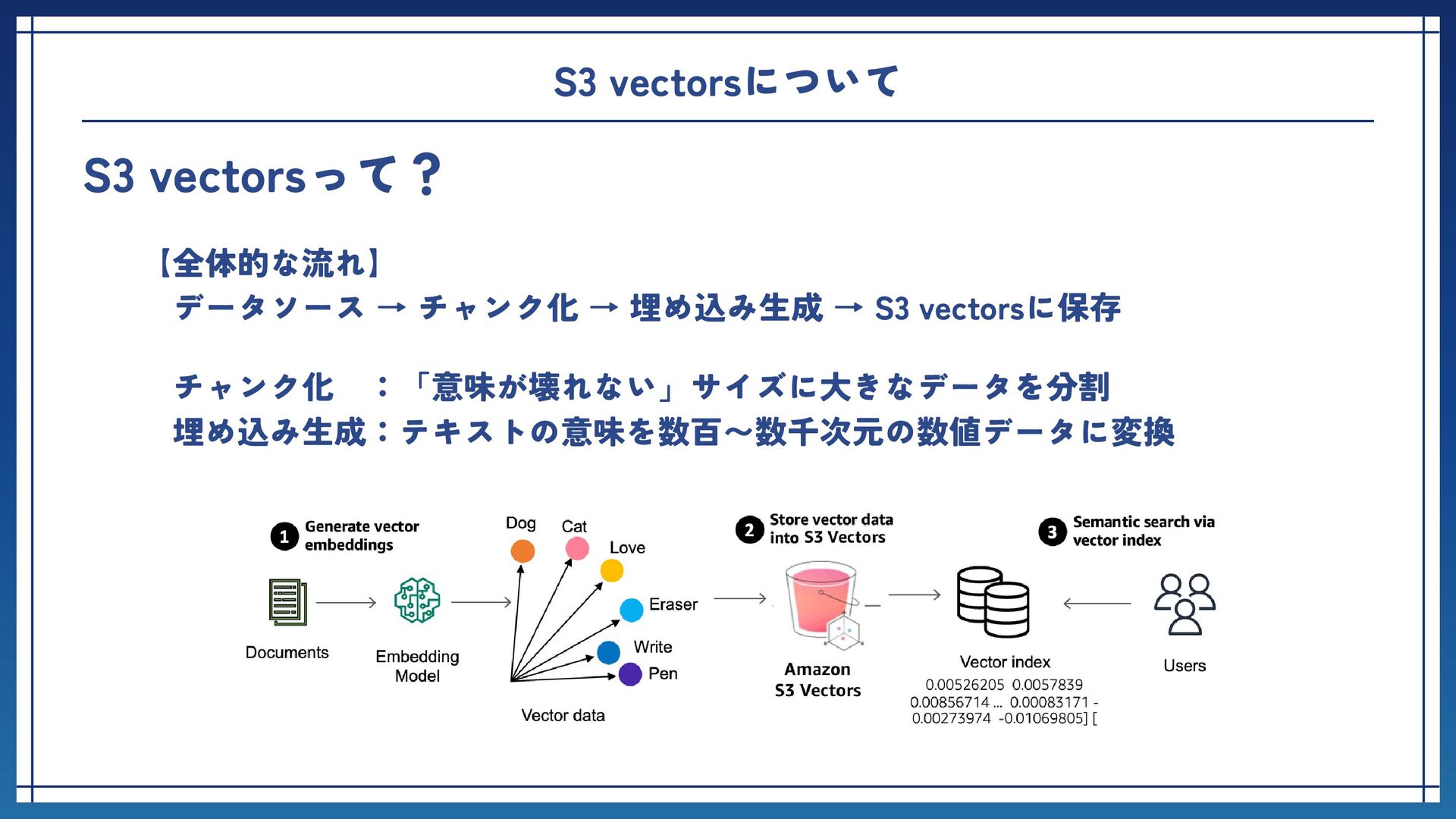 → 埋め込み生成 → S3 vectorsに保存 チャンク化 :「意味が壊れない」サイズに大きなデータを分割 埋め込み生成:テキストの意味を数百〜数千次元の数値データに変換