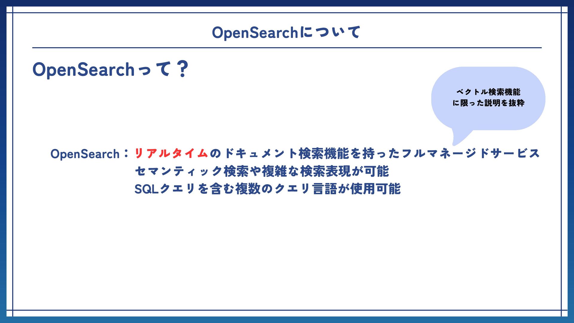 機能の設計と 画面の構成 ベクトル検索機能 に限った説明を抜粋 OpenSearchについて OpenSearchって? OpenSearch:リアルタイムのドキュメント検索機能を持ったフルマネージドサービス セマンティック検索や複雑な検索表現が可能