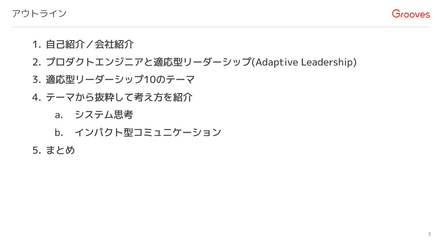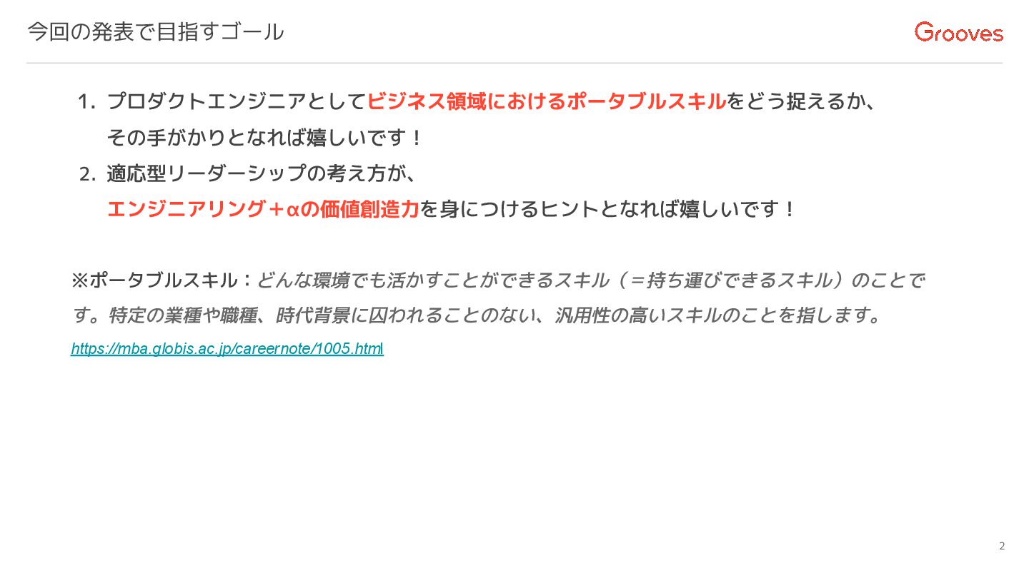 2 今回の発表で目指すゴール 1. プロダクトエンジニアとしてビジネス領域におけるポータブルスキルをどう捉えるか、 その手がかりとなれば嬉しいです! 2. 適応型リーダーシップの考え方が、 エンジニアリング+αの価値創造力を身につけるヒントとなれば嬉しいです! ※ポータブルスキル:どんな環境でも活かすことができるスキル(=持ち運びできるスキル)のことで す。特定の業種や職種、時代背景に囚われることのない、汎用性の高いスキルのことを指します。