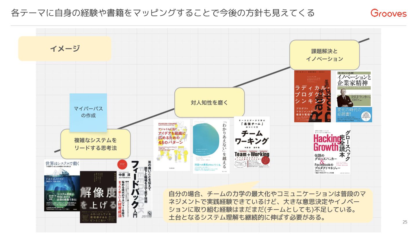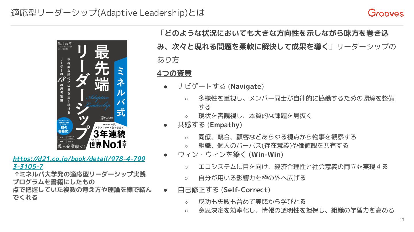 ◦ 多様性を重視し、メンバー同士が自律的に協働するための環境を整備 する ◦ 現状を客観視し、本質的な課題を見抜く • 共感する (Empathy) ◦ 同僚、競合、顧客などあらゆる視点から物事を観察する ◦ 組織、個人のパーパス(存在意義)や価値観を共有する • ウィン・ウィンを築く (Win-Win) ◦ エコシステムに目を向け、経済合理性と社会意義の両立を実現する ◦ 自分が用いる影響力を枠の外へ広げる • 自己修正する (Self-Correct) ◦ 成功も失敗も含めて実践から学びとる ◦ 意思決定を効率化し、情報の透明性を担保し、組織の学習力を高める https://d21.co.jp/book/detail/978-4-799 3-3105-7 ↑ミネルバ大学発の適応型リーダーシップ実践 プログラムを書籍にしたもの 点で把握していた複数の考え方や理論を線で結ん でくれる