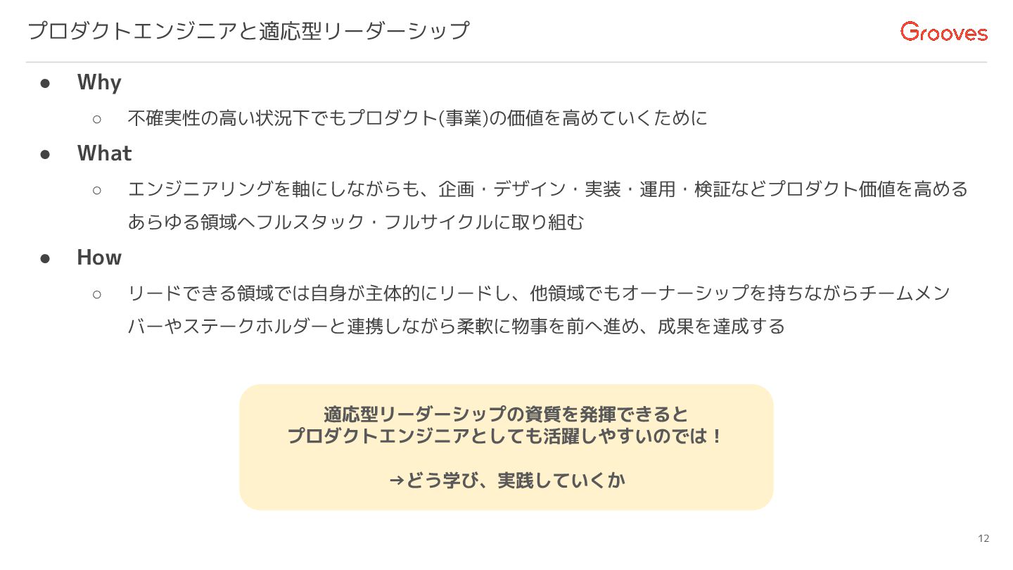 あらゆる領域へフルスタック・フルサイクルに取り組む • How ◦ リードできる領域では自身が主体的にリードし、他領域でもオーナーシップを持ちながらチームメン バーやステークホルダーと連携しながら柔軟に物事を前へ進め、成果を達成する 適応型リーダーシップの資質を発揮できると プロダクトエンジニアとしても活躍しやすいのでは! →どう学び、実践していくか