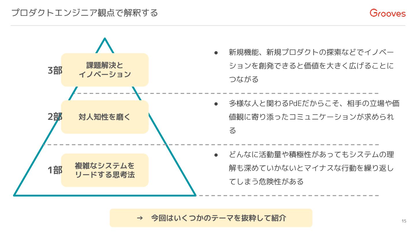 • どんなに活動量や積極性があってもシステムの理 解も深めていかないとマイナスな行動を繰り返し てしまう危険性がある 複雑なシステムを リードする思考法 対人知性を磨く 課題解決と イノベーション 1部 2部 3部 → 今回はいくつかのテーマを抜粋して紹介