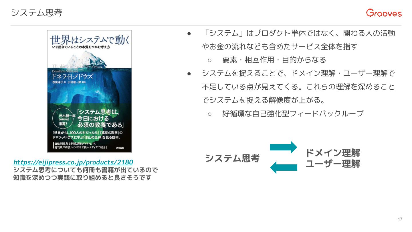 でシステムを捉える解像度が上がる。 ◦ 好循環な自己強化型フィードバックループ https://eijipress.co.jp/products/2180 システム思考についても何冊も書籍が出ているので 知識を深めつつ実践に取り組めると良さそうです システム思考 ドメイン理解 ユーザー理解