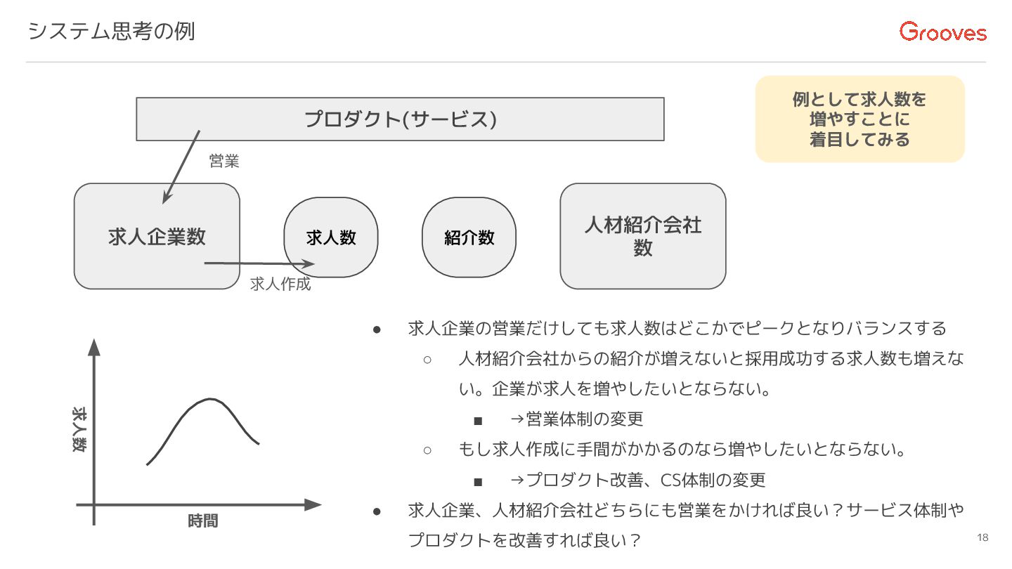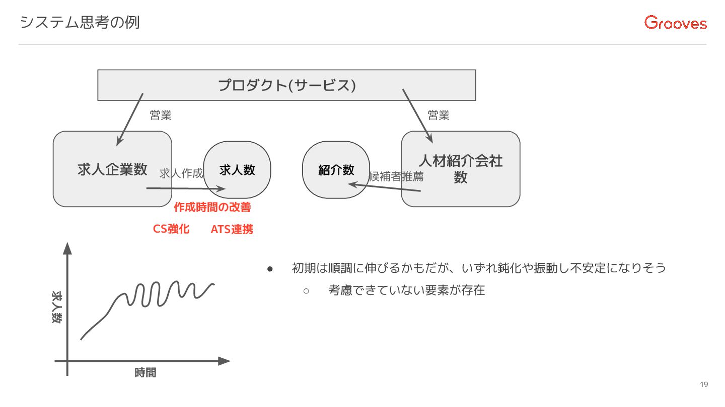 18 システム思考の例 求人企業数 プロダクト(サービス) 人材紹介会社 数 求人数 紹介数 営業 求人作成