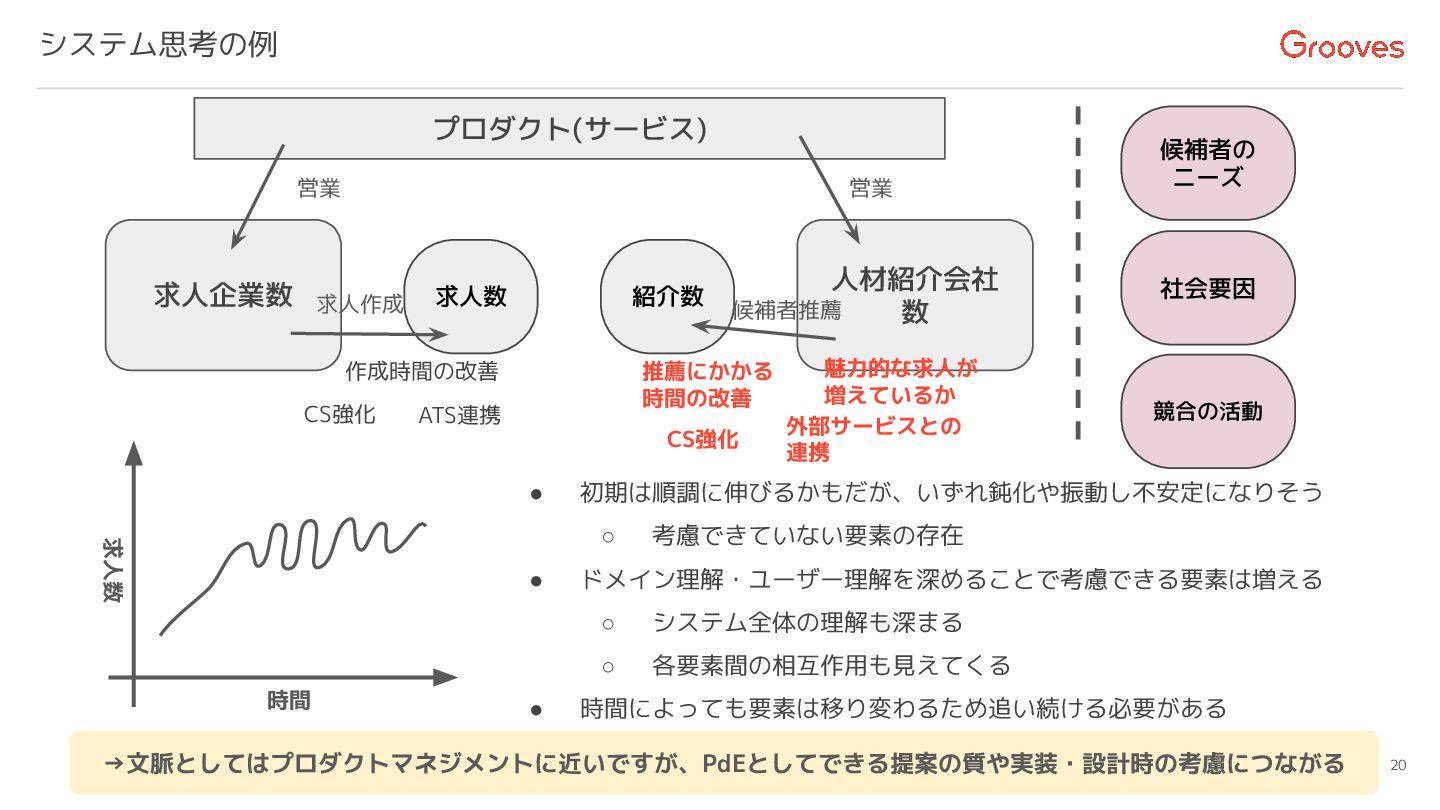時間 求人数 • 初期は順調に伸びるかもだが、いずれ鈍化や振動し不安定になりそう ◦ 考慮できていない要素の存在 • ドメイン理解・ユーザー理解を深めることで考慮できる要素は増える ◦ システム全体の理解も深まる ◦ 各要素間の相互作用も見えてくる • 時間によっても要素は移り変わるため追い続ける必要がある 候補者の ニーズ 社会要因 競合の活動 営業 候補者推薦 作成時間の改善 CS強化 ATS連携 推薦にかかる 時間の改善 外部サービスとの 連携 CS強化 魅力的な求人が 増えているか →文脈としてはプロダクトマネジメントに近いですが、PdEとしてできる提案の質や実装・設計時の考慮につながる