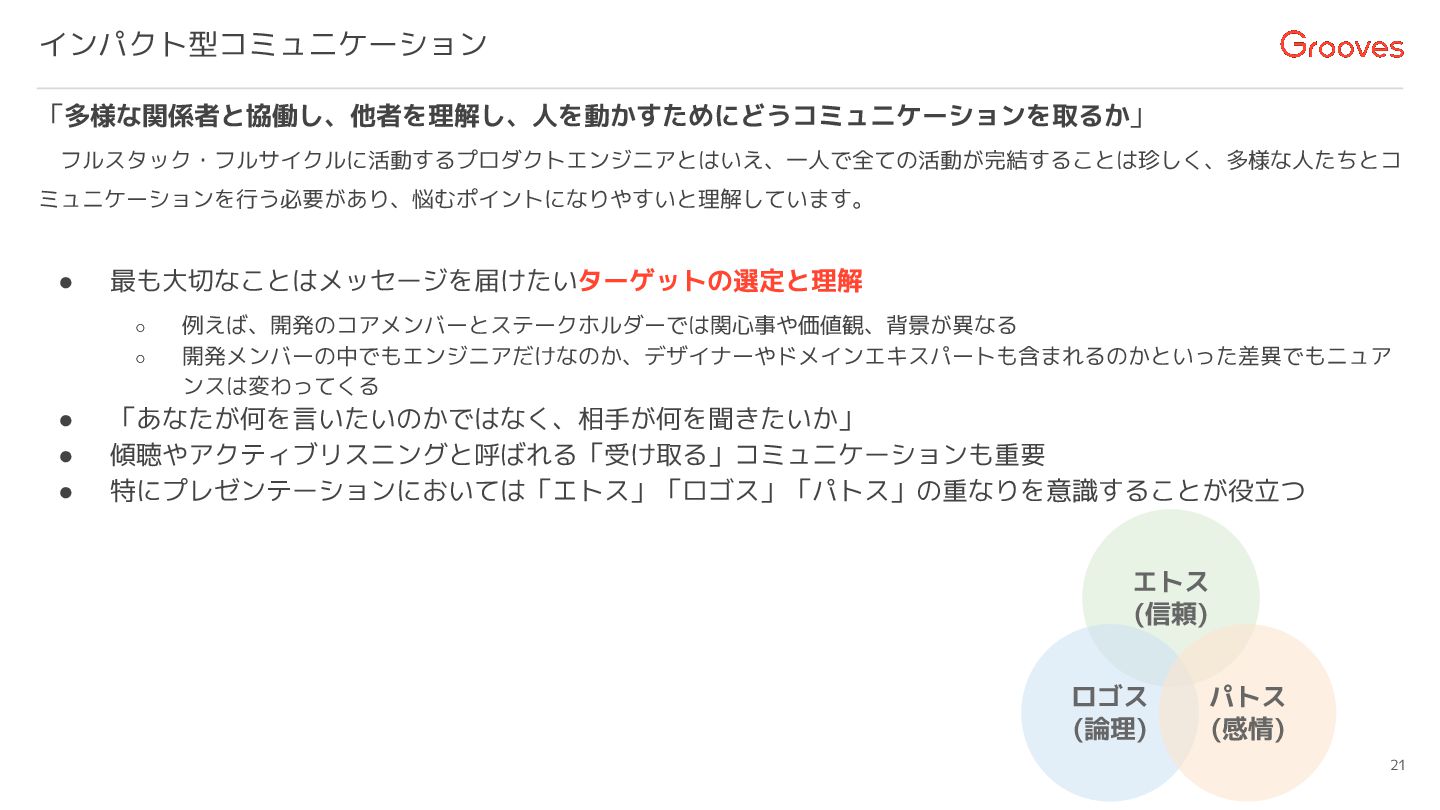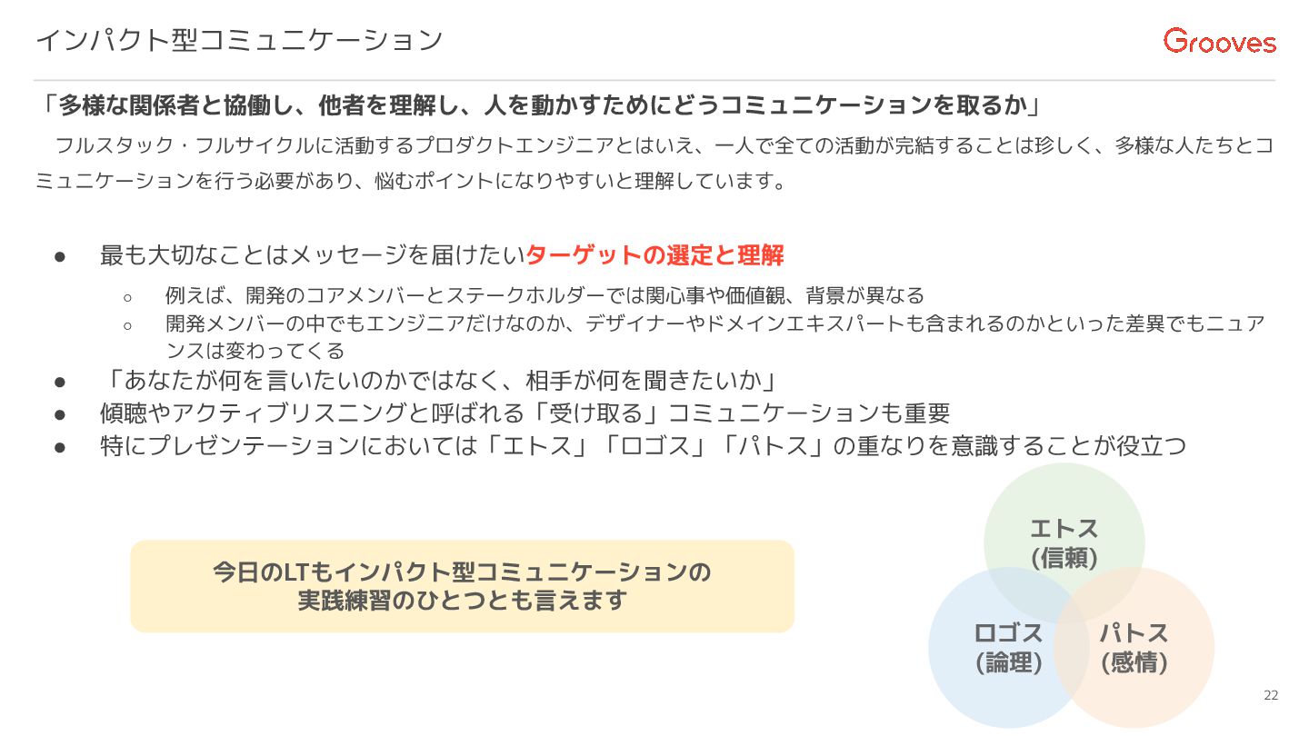 開発メンバーの中でもエンジニアだけなのか、デザイナーやドメインエキスパートも含まれるのかといった差異でもニュア ンスは変わってくる • 「あなたが何を言いたいのかではなく、相手が何を聞きたいか」 • 傾聴やアクティブリスニングと呼ばれる「受け取る」コミュニケーションも重要 • 特にプレゼンテーションにおいては「エトス」「ロゴス」「パトス」の重なりを意識することが役立つ エトス (信頼) ロゴス (論理) パトス (感情) 今日のLTもインパクト型コミュニケーションの 実践練習のひとつとも言えます