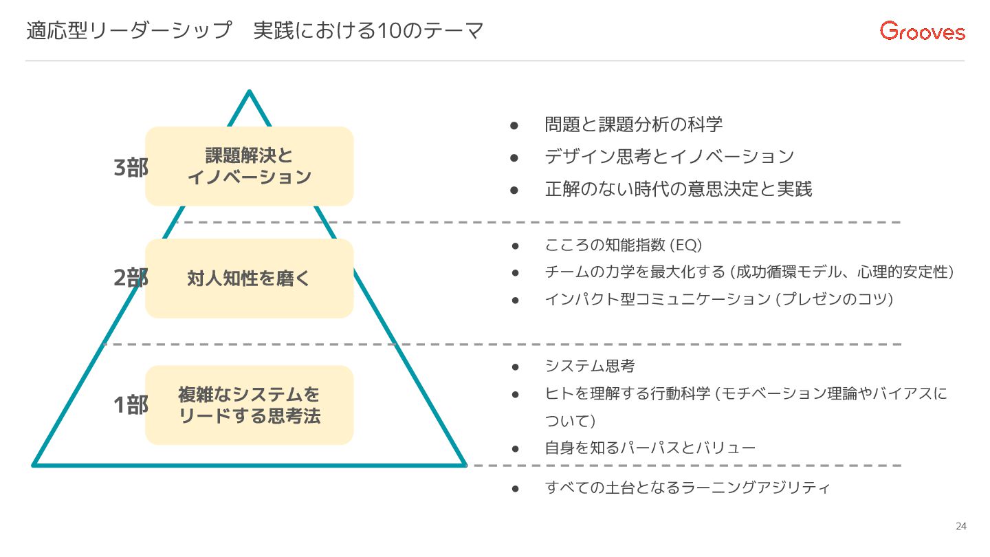デザイン思考とイノベーション • 正解のない時代の意思決定と実践 • こころの知能指数 (EQ) • チームの力学を最大化する (成功循環モデル、心理的安定性) • インパクト型コミュニケーション (プレゼンのコツ) • システム思考 • ヒトを理解する行動科学 (モチベーション理論やバイアスに ついて) • 自身を知るパーパスとバリュー • すべての土台となるラーニングアジリティ 1部 2部 3部