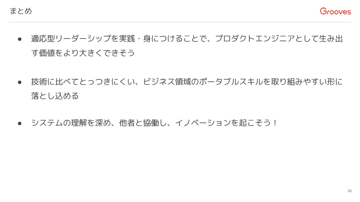 26 まとめ • 適応型リーダーシップを実践・身につけることで、プロダクトエンジニアとして生み出 す価値をより大きくできそう • 技術に比べてとっつきにくい、ビジネス領域のポータブルスキルを取り組みやすい形に 落とし込める • システムの理解を深め、他者と協働し、イノベーションを起こそう!