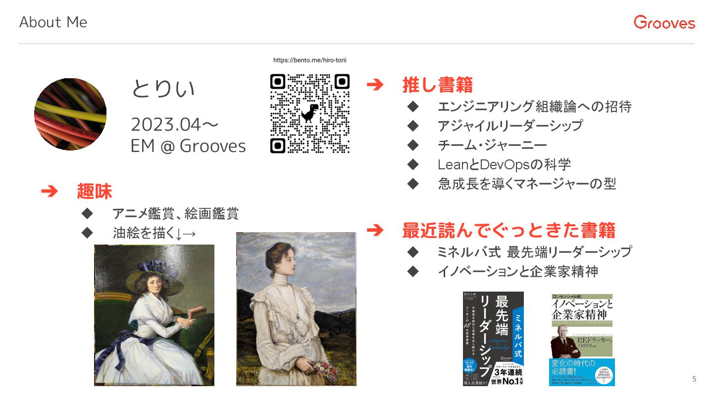 チーム・ジャーニー ◆ LeanとDevOpsの科学 ◆ 急成長を導くマネージャーの型 ➔ 最近読んでぐっときた書籍 ◆ ミネルバ式 最先端リーダーシップ ◆ イノベーションと企業家精神 2023.04〜 EM @ Grooves とりい ➔ 趣味 ◆ アニメ鑑賞、絵画鑑賞 ◆ 油絵を描く↓→