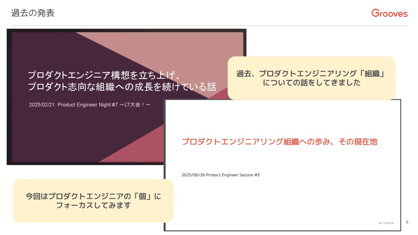 8 過去の発表 過去、プロダクトエンジニアリング「組織」 についての話をしてきました 今回はプロダクトエンジニアの「個」に フォーカスしてみます