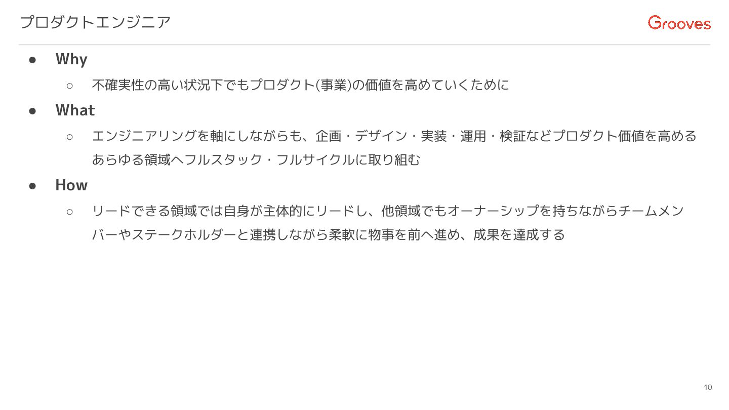 あらゆる領域へフルスタック・フルサイクルに取り組む • How ◦ リードできる領域では自身が主体的にリードし、他領域でもオーナーシップを持ちながらチームメン バーやステークホルダーと連携しながら柔軟に物事を前へ進め、成果を達成する