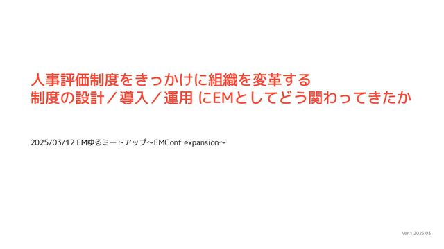 2025/03/12 EMゆるミートアップ〜EMConf expansion〜 Ver.1 2025.03 人事評価制度をきっかけに組織を変革する 制度の設計/導入/運用 にEMとしてどう関わってきたか