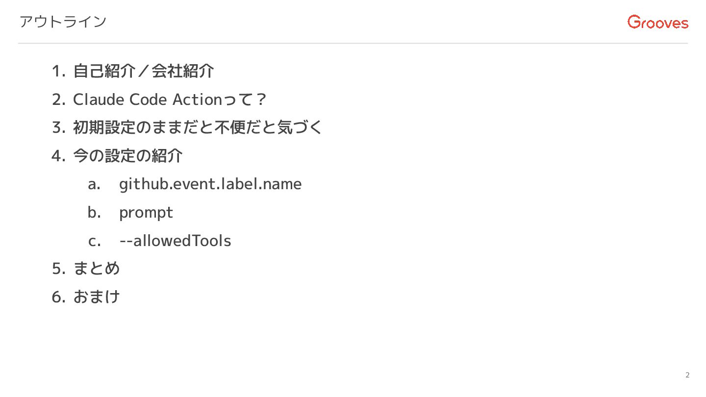 2 アウトライン 1. 自己紹介/会社紹介 2. Claude Code Actionって? 3. 初期設定のままだと不便だと気づく