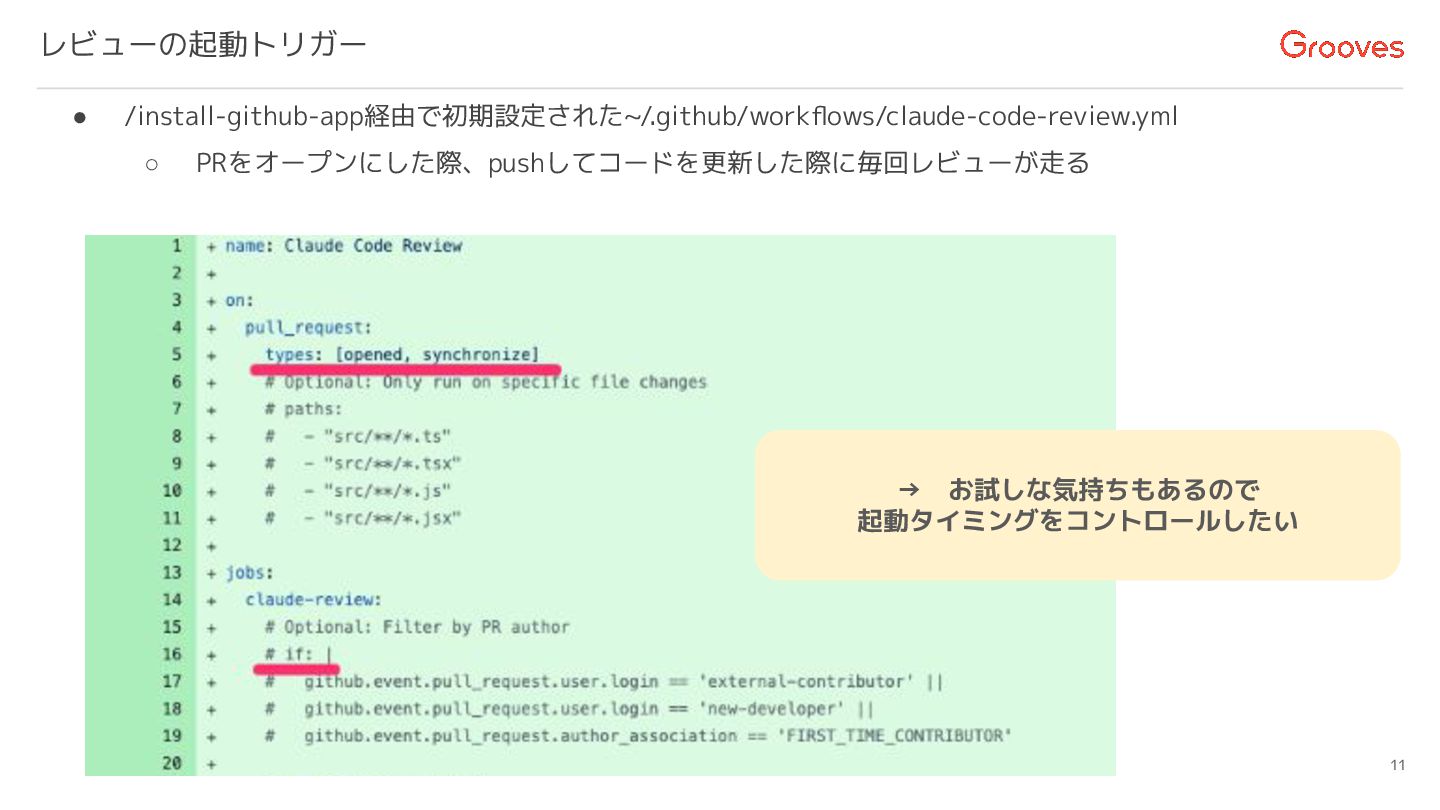 11 レビューの起動トリガー • /install-github-app経由で初期設定された~/.github/workflows/claude-code-review.yml ◦ PRをオープンにした際、pushしてコードを更新した際に毎回レビューが走る → お試しな気持ちもあるので 起動タイミングをコントロールしたい