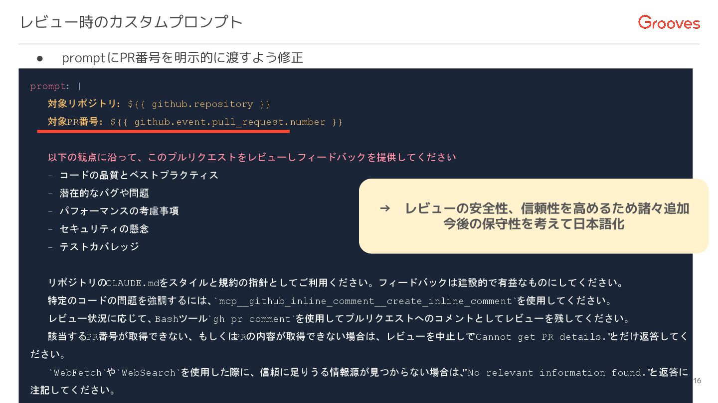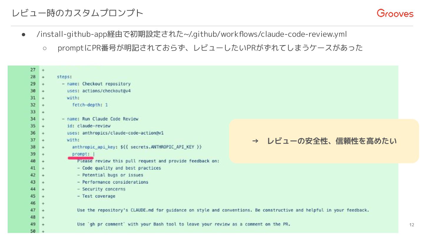 12 レビュー時のカスタムプロンプト • /install-github-app経由で初期設定された~/.github/workflows/claude-code-review.yml ◦ promptにPR番号が明記されておらず、レビューしたいPRがずれてしまうケースがあった → レビューの安全性、信頼性を高めたい