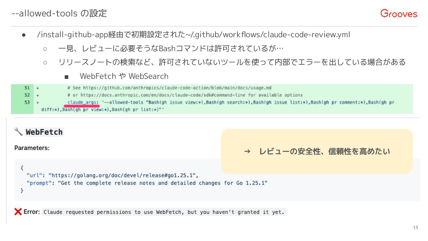 13 --allowed-tools の設定 • /install-github-app経由で初期設定された~/.github/workflows/claude-code-review.yml ◦ 一見、レビューに必要そうなBashコマンドは許可されているが… ◦ リリースノートの検索など、許可されていないツールを使って内部でエラーを出している場合がある ▪