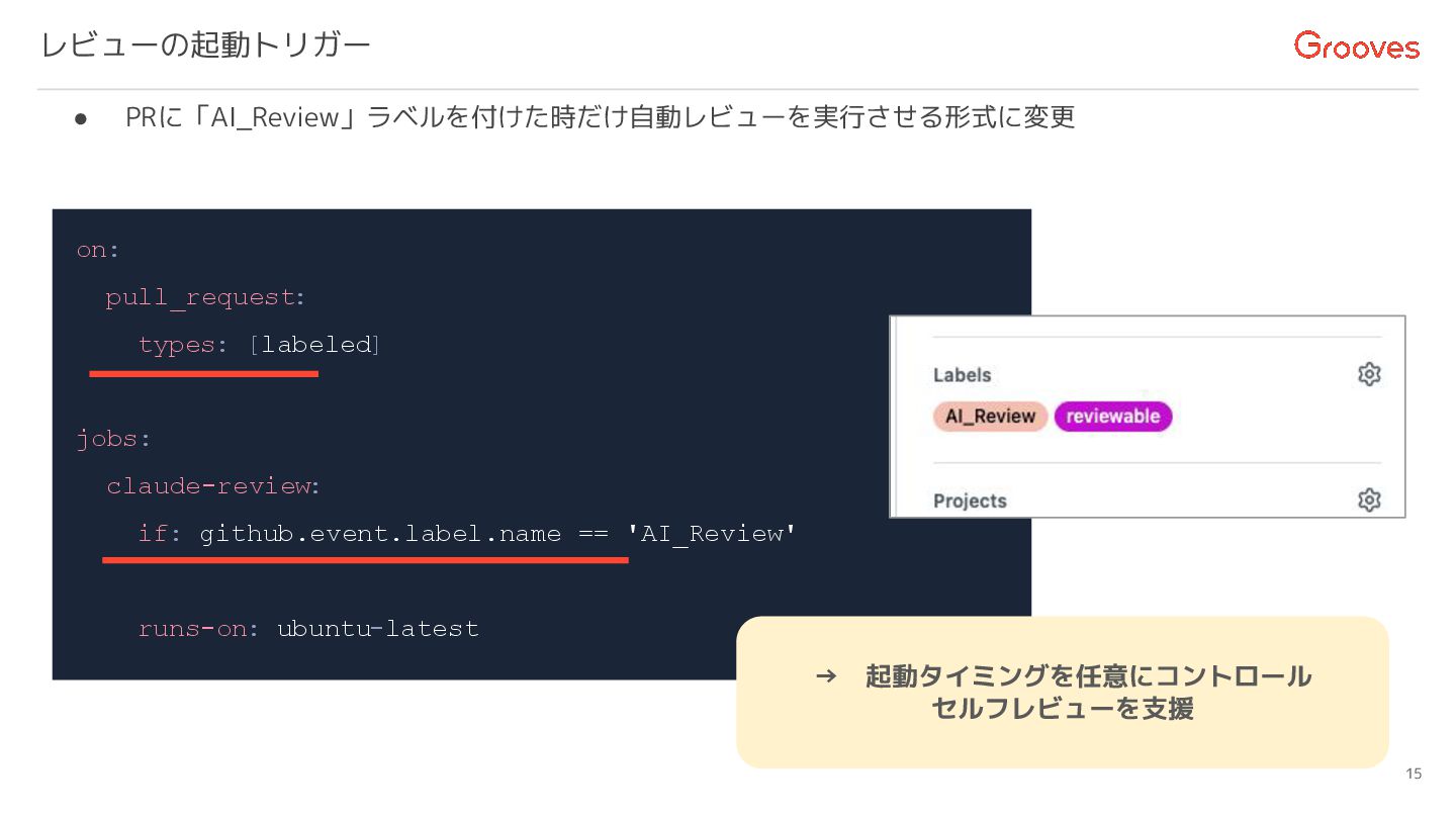 if: github.event.label.name == 'AI_Review' runs-on: ubuntu-latest → 起動タイミングを任意にコントロール セルフレビューを支援