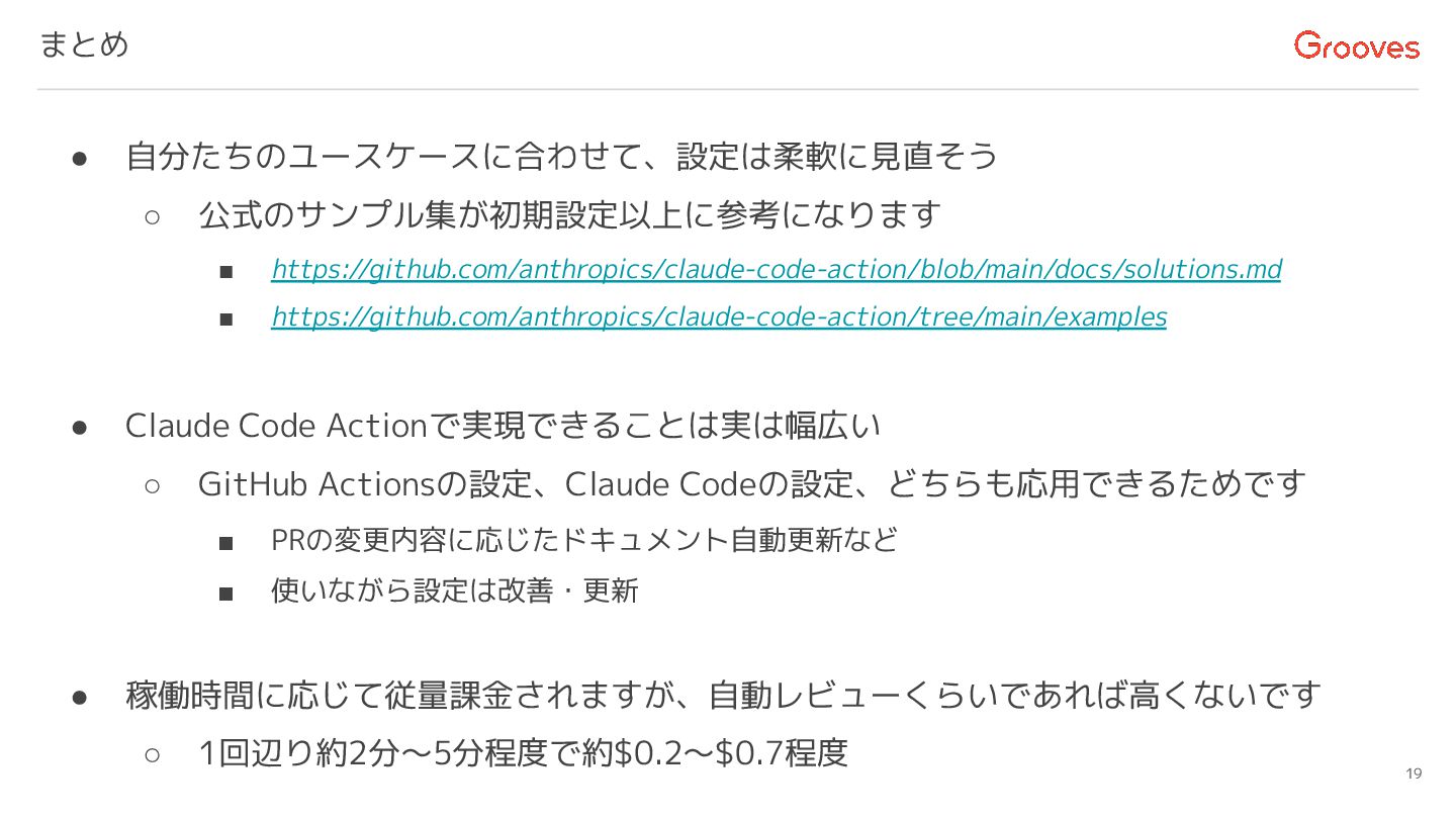 • Claude Code Actionで実現できることは実は幅広い ◦ GitHub Actionsの設定、Claude Codeの設定、どちらも応用できるためです ▪ PRの変更内容に応じたドキュメント自動更新など ▪ 使いながら設定は改善・更新 • 稼働時間に応じて従量課金されますが、自動レビューくらいであれば高くないです ◦ 1回辺り約2分〜5分程度で約$0.2〜$0.7程度