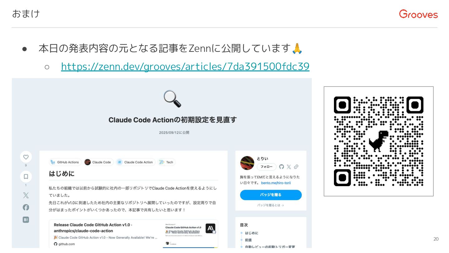 20 おまけ • 本日の発表内容の元となる記事をZennに公開しています🙏 ◦ https://zenn.dev/grooves/articles/7da391500fdc39